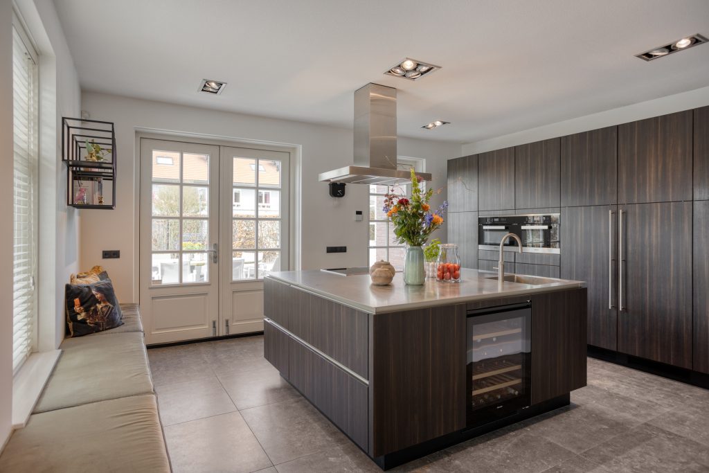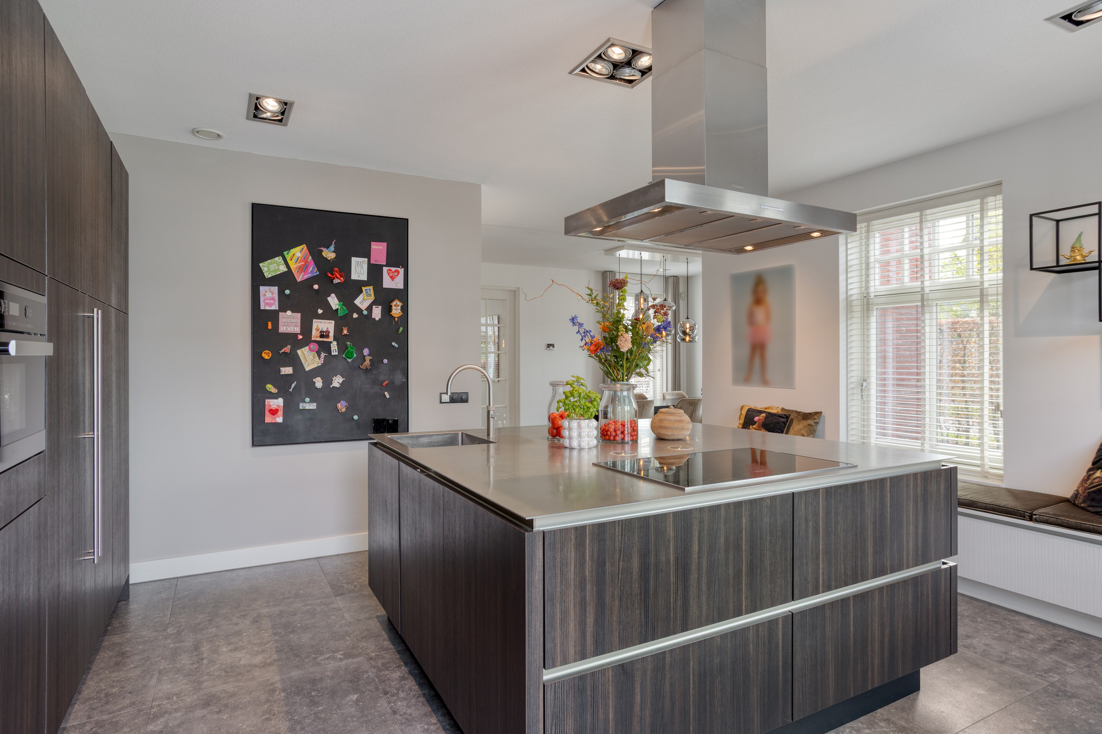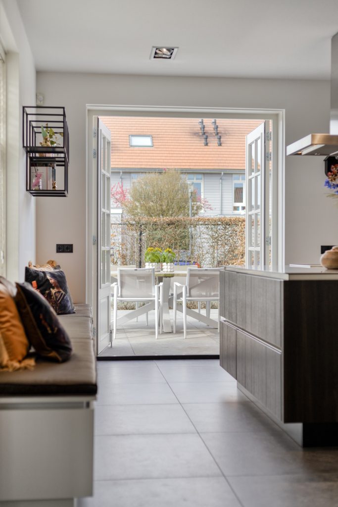 To the side is a lovely built-in bench with drawers where you can enjoy a drink while someone is cooking. Here, too, you have a view of the (back) garden and can go outside through the French doors and a pedestrian door.