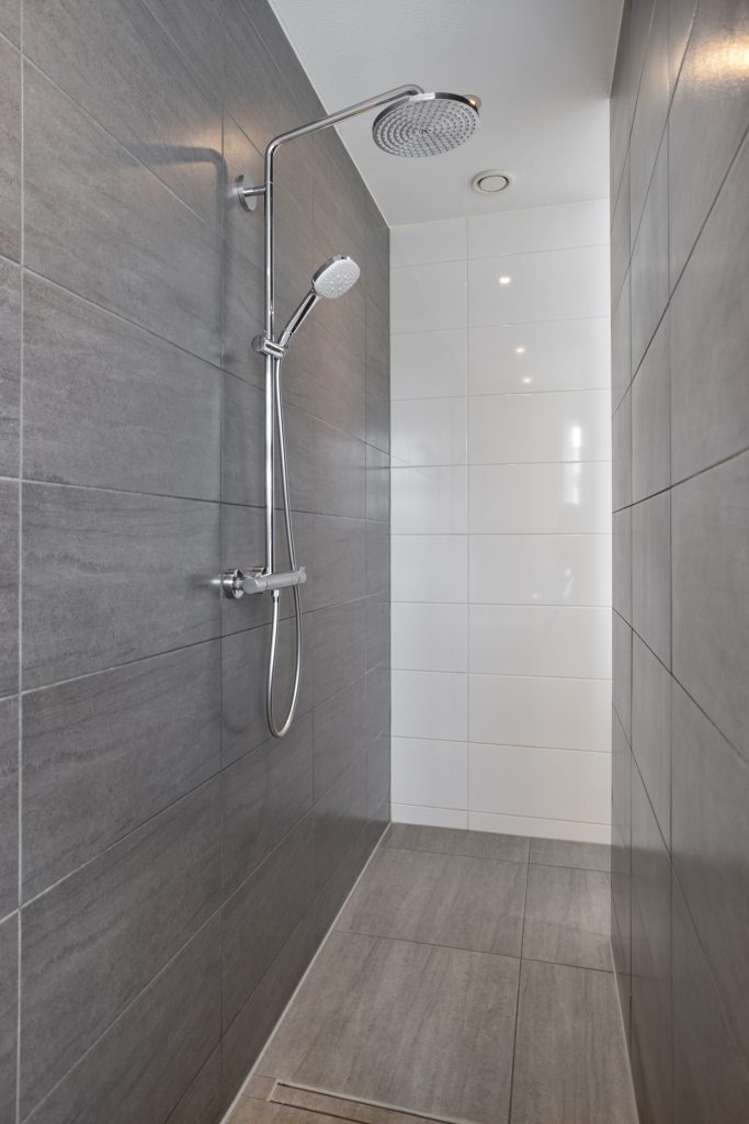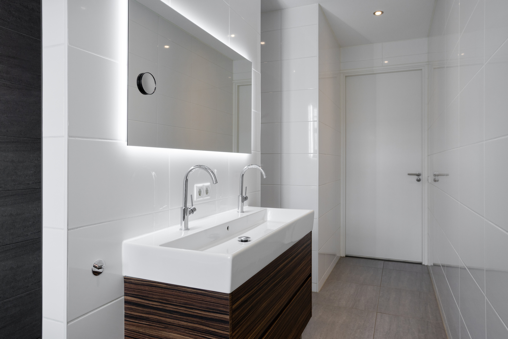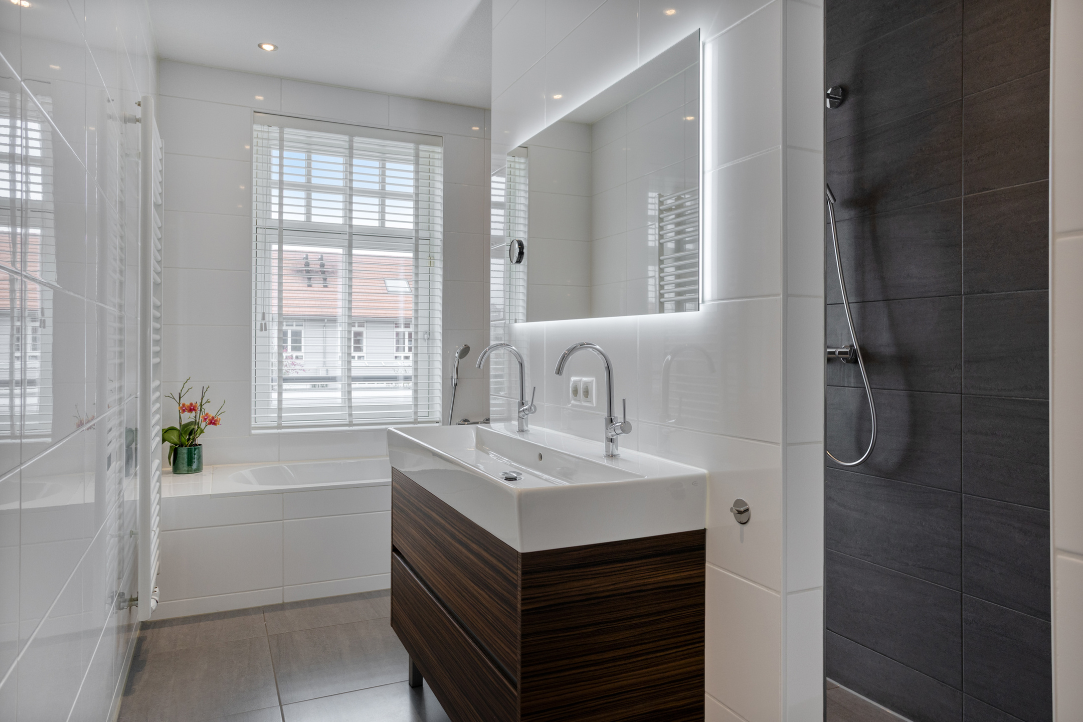 De exclusieve badkamer is uitgevoerd met premium sanitair en biedt een spa-achtige beleving met een royaal ligbad, riante inloopdouche en een wastafel met 2 kranen in een badkamer meubel.