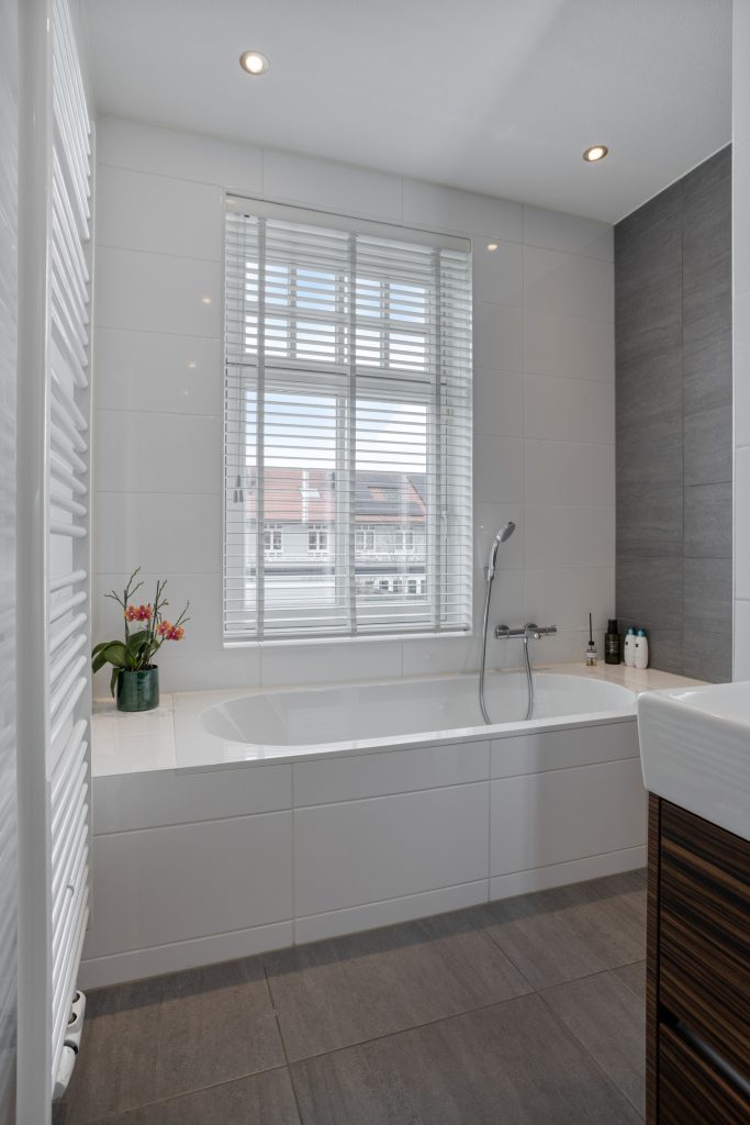 The exclusive bathroom is fitted with premium sanitary ware and offers a spa-like experience with a spacious bathtub, a generous walk-in shower, and a washbasin with 2 taps in a vanity unit.