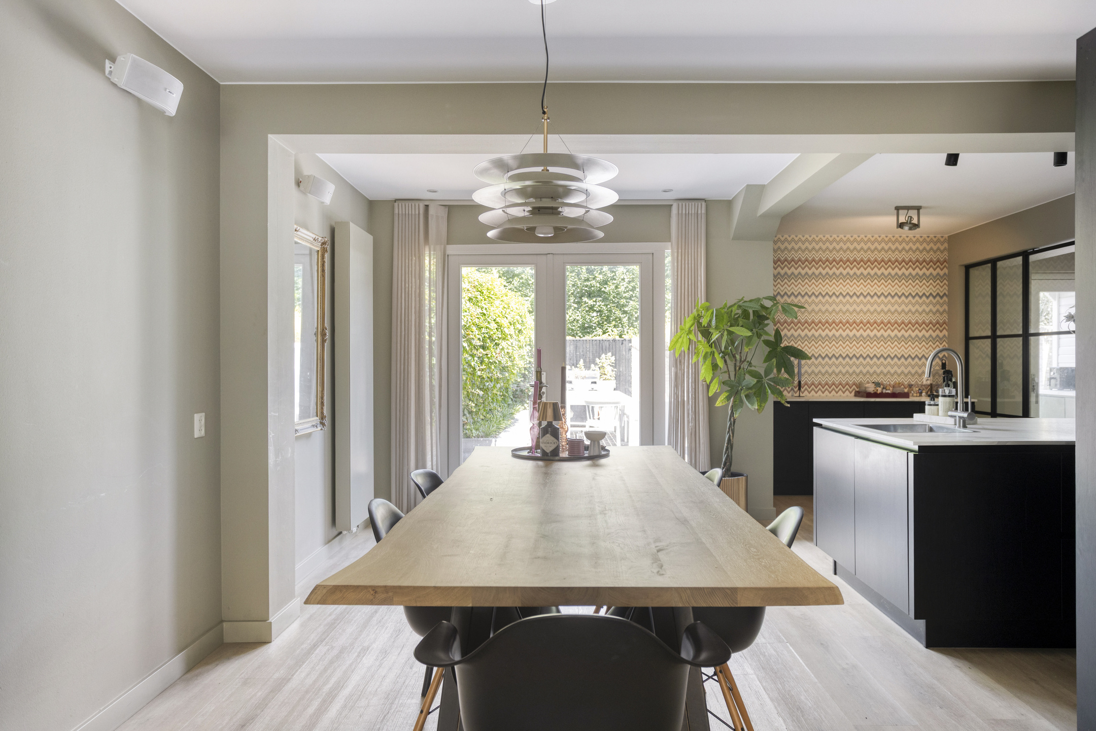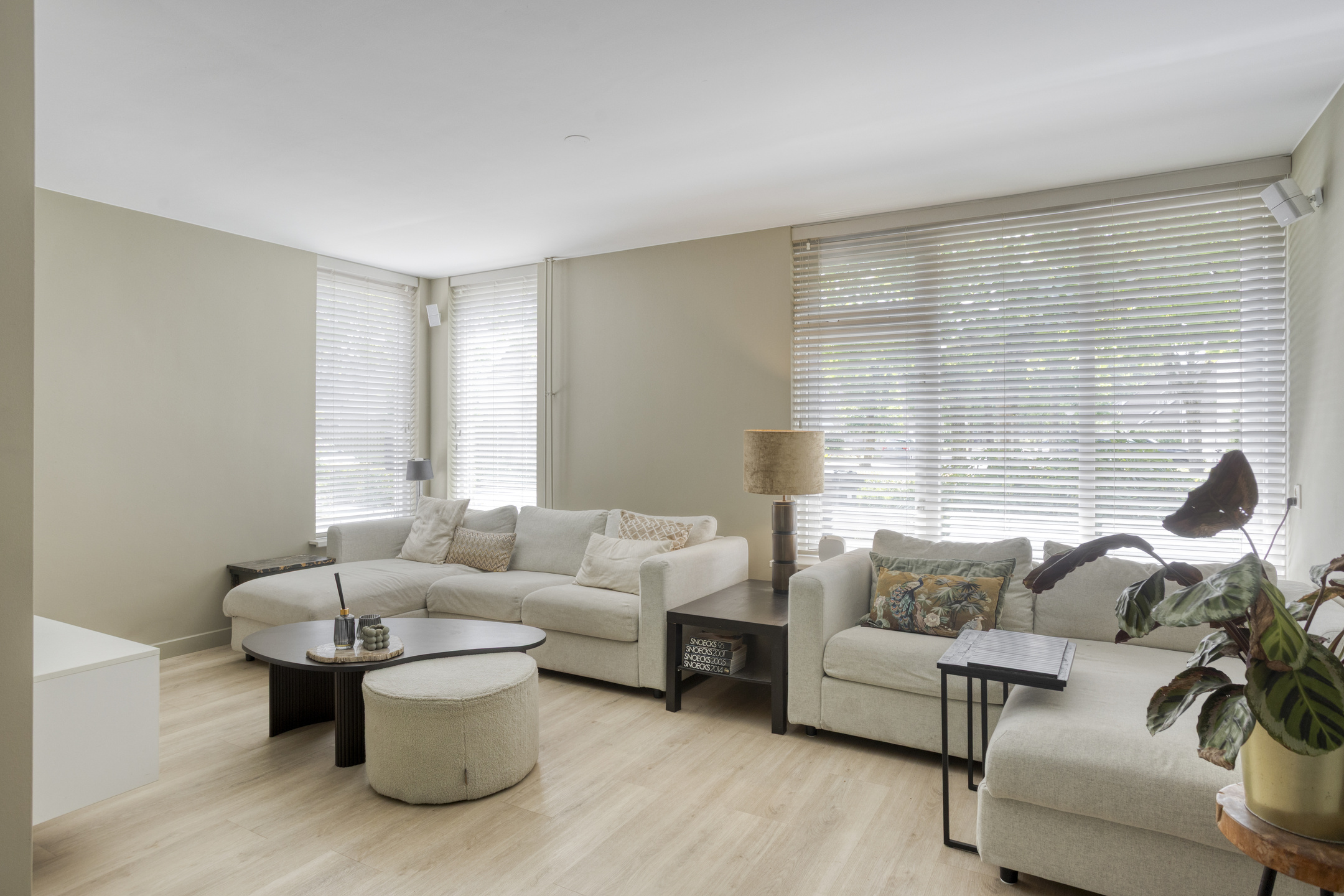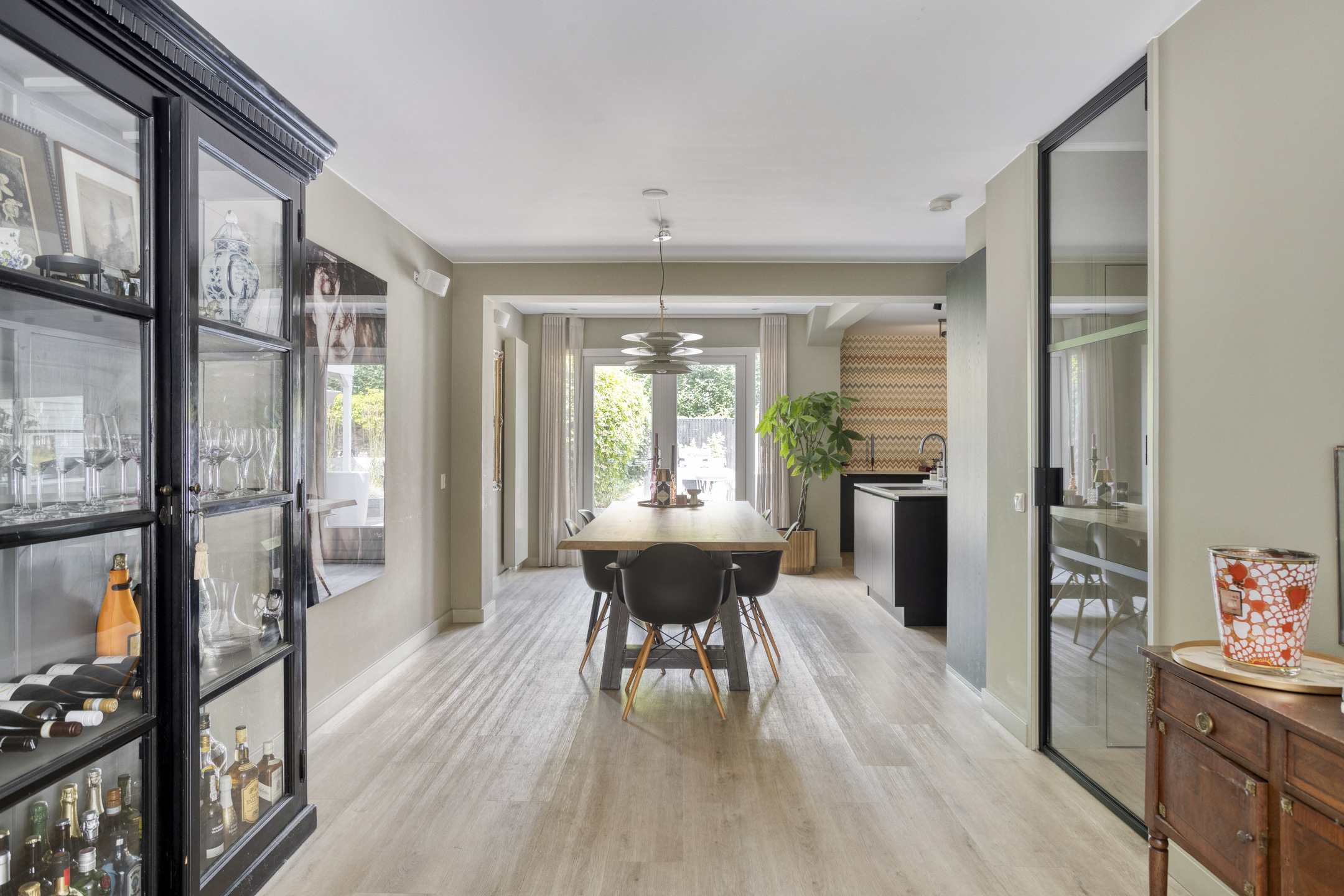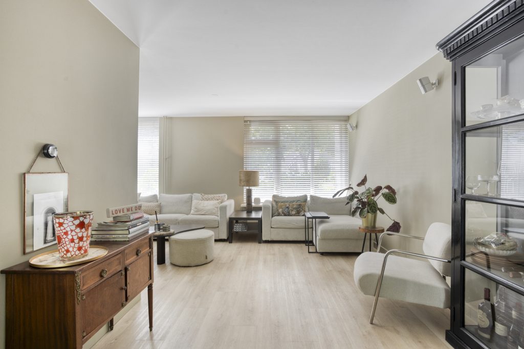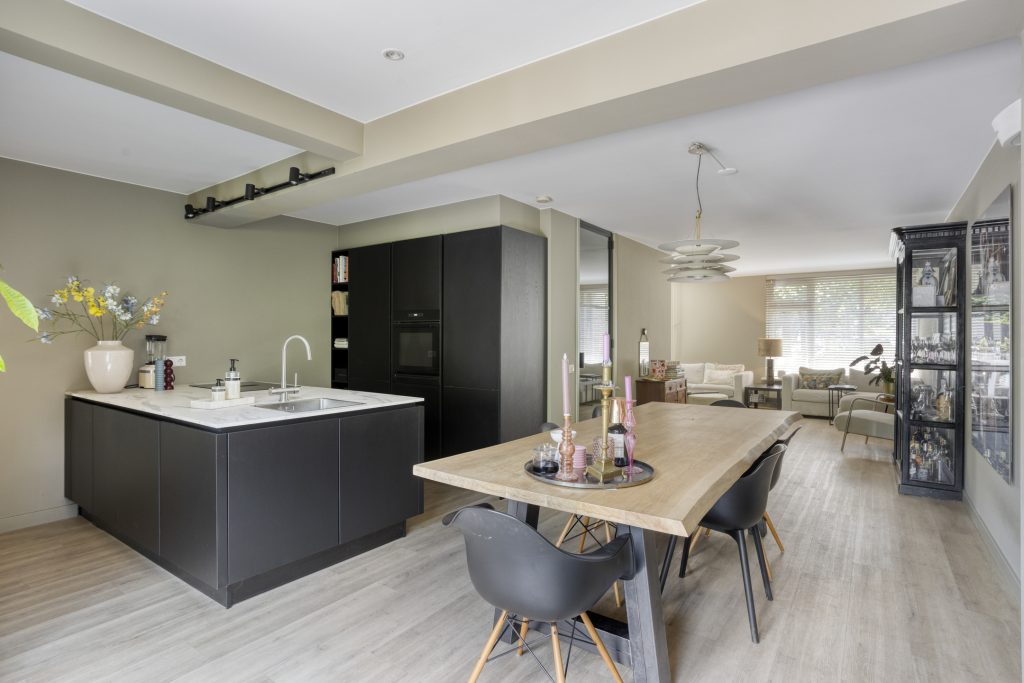 Zeer sfeervolle, ruime aan de achterzijde uitgebouwde living met pvc vloer. Aan de voorzijde kan men heerlijk met het hele gezin genieten van een gezellige zitruimte met veel lichtinval door de vele en hoge raampartijen en aan de achterzijde is het eetgedeelte met de open keuken. Middels openslaande tuindeuren is het prachtige terras te bereiken.