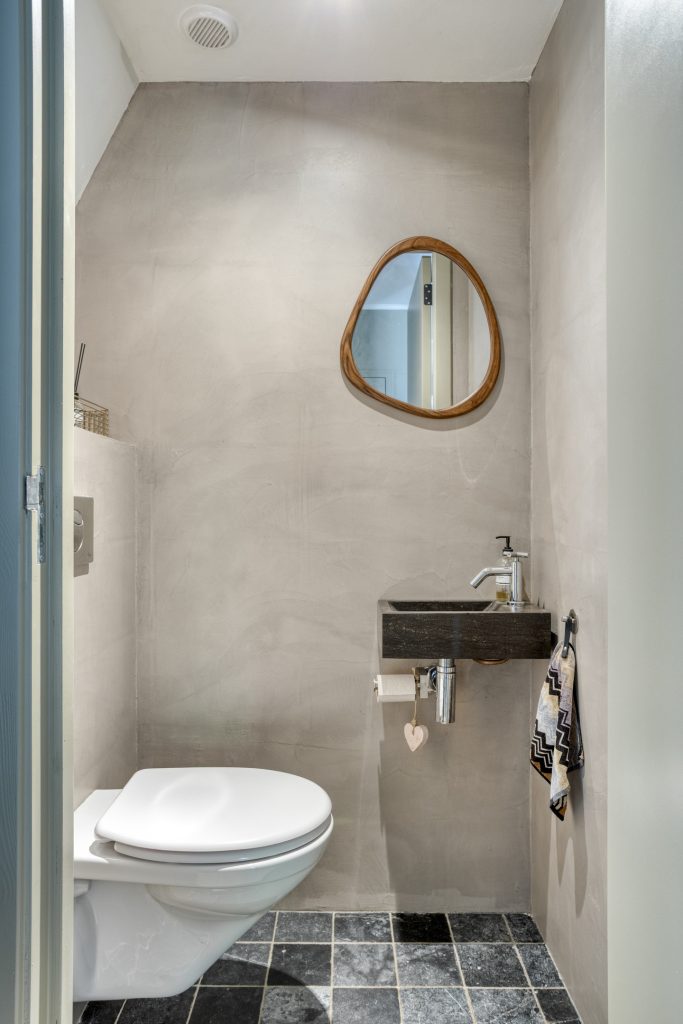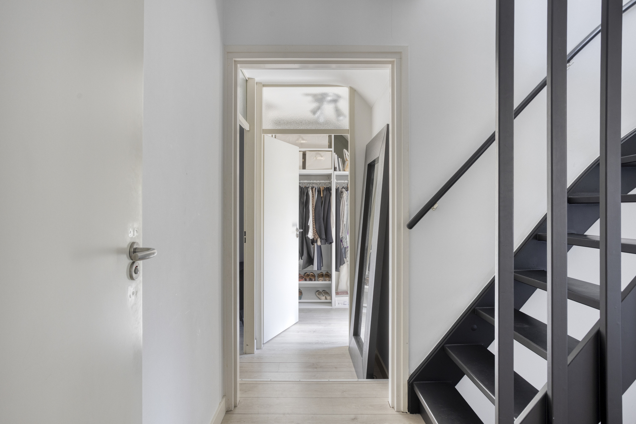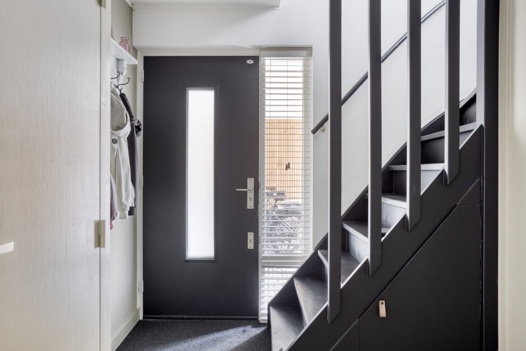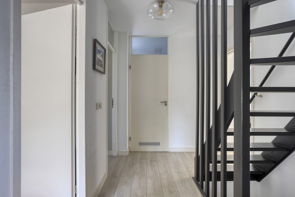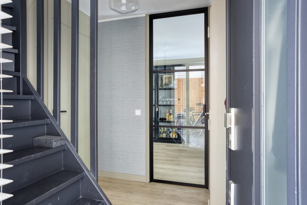 Hal met vernieuwde meterkast (2023) en toiletruimte. Toiletruimte voorzien van een zwevend closet en fonteintje. Trapopgang. Vanuit de hal is de woonkamer te bereiken via een stalen op maat gemaakte deur.