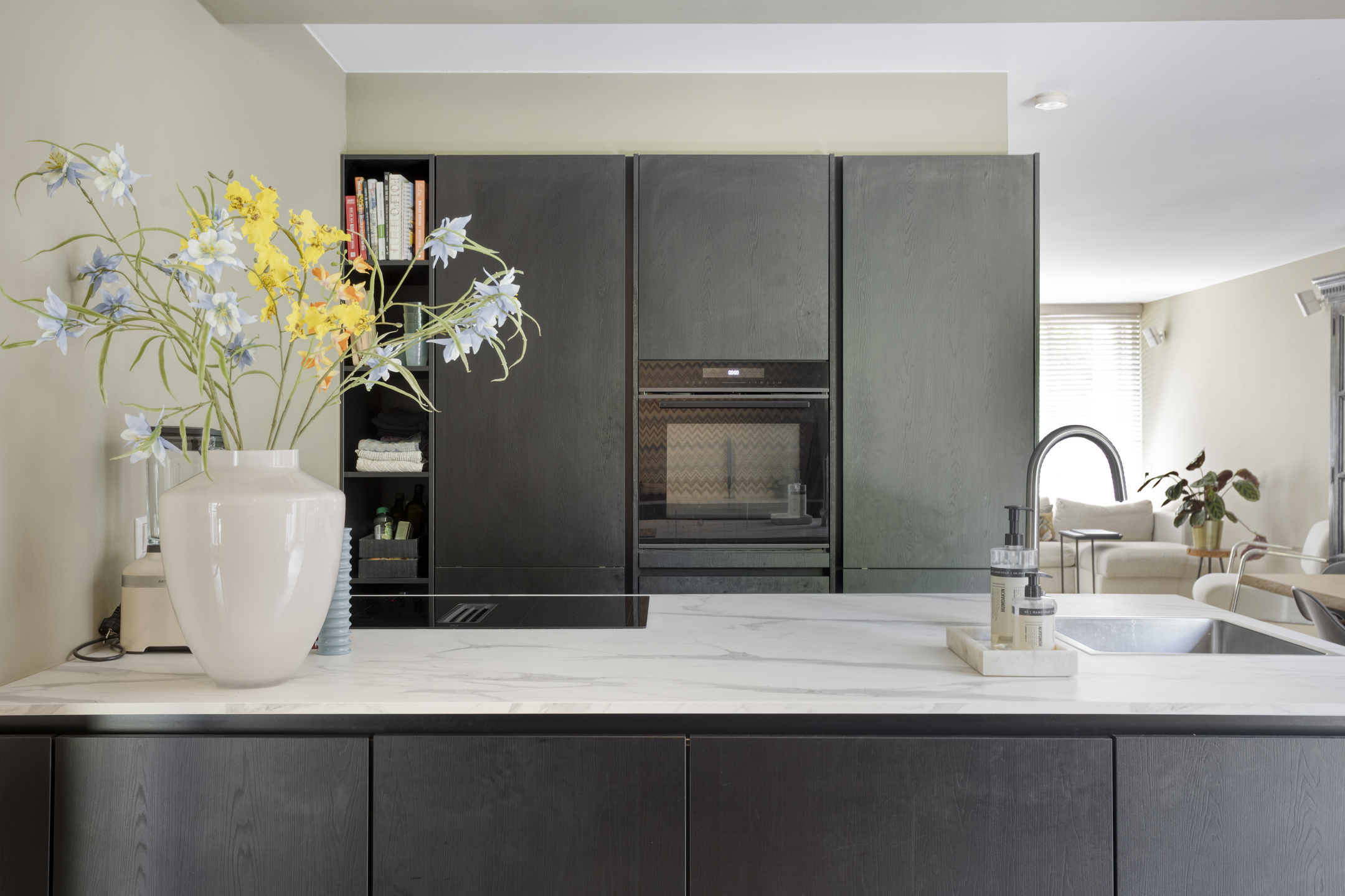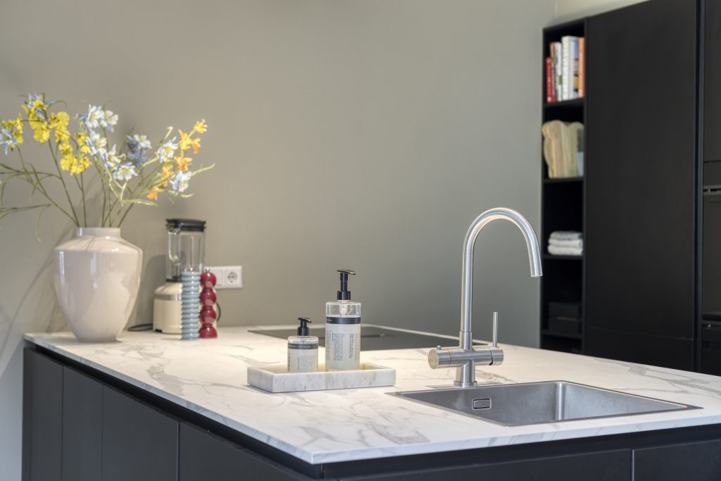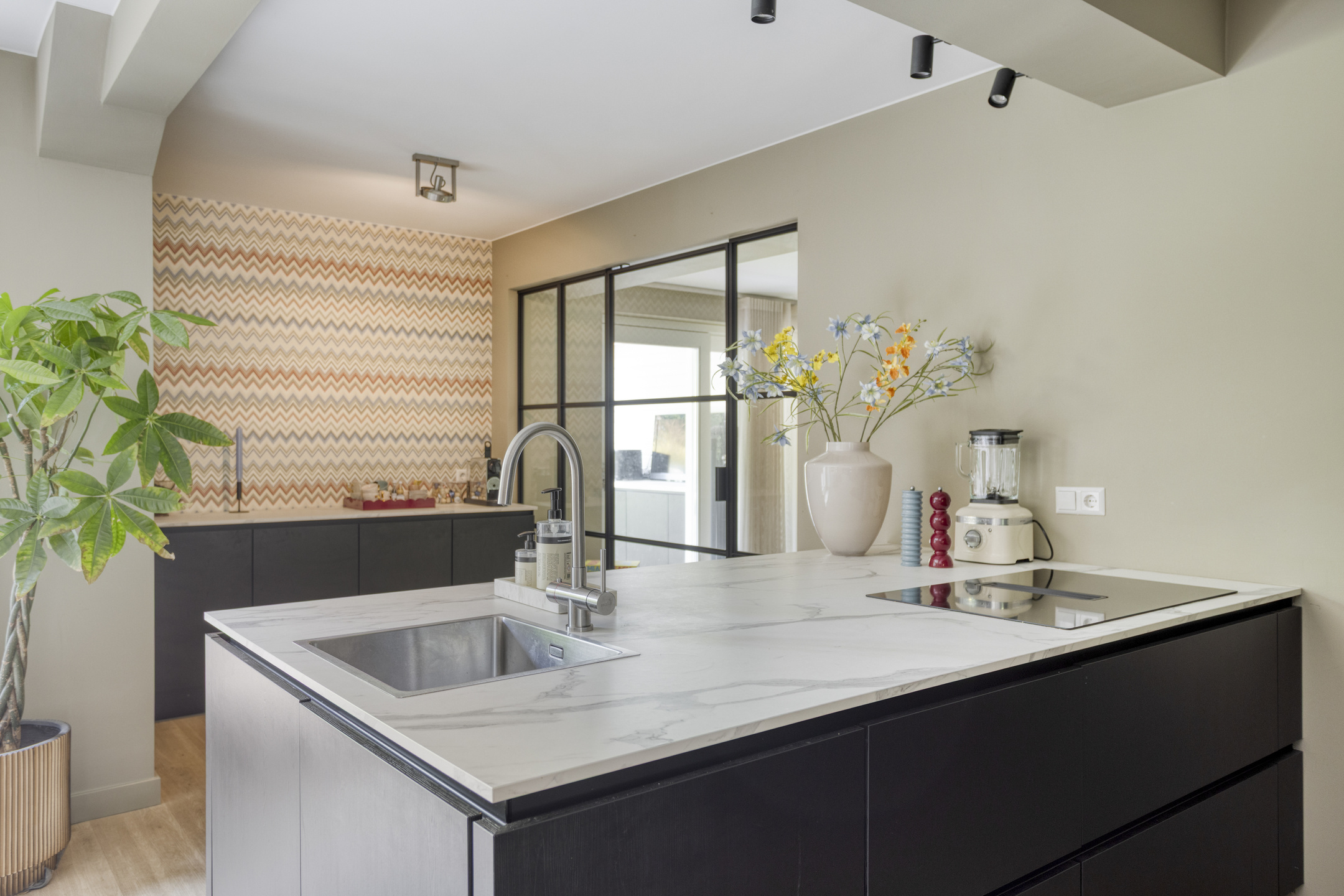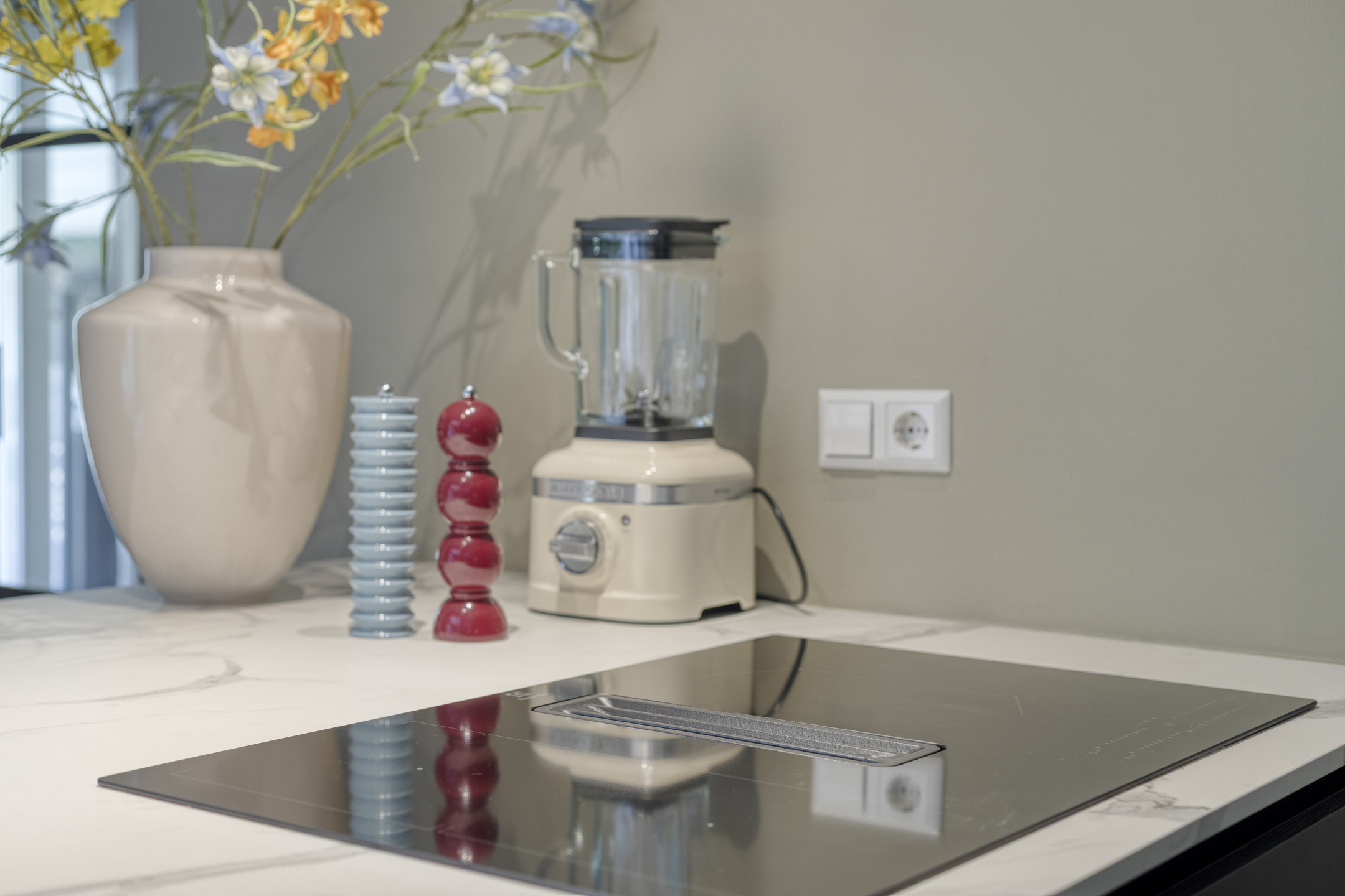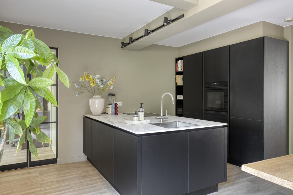 De luxe moderne keuken (2023) beschikt over een keukeninstallatie met een korean aanrechtblad met spoelbak, kookeiland met inductie kookplateau met afzuiging, heteluchtoven/combimagnetron, koelkast, vrieskast, vaatwasser en ruim voldoende kastruimte.