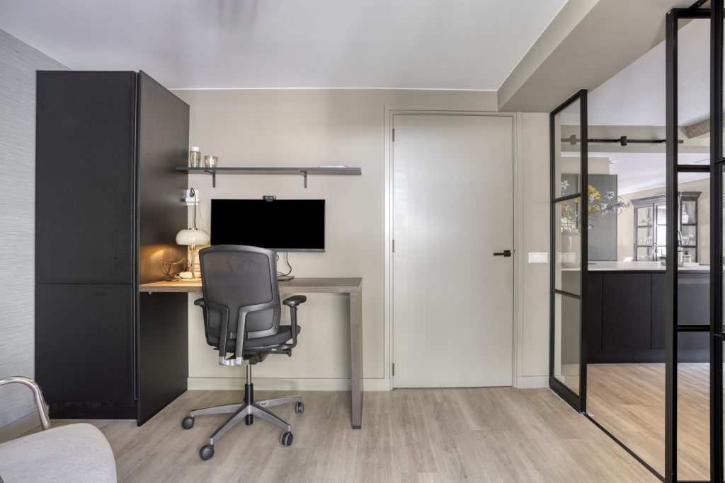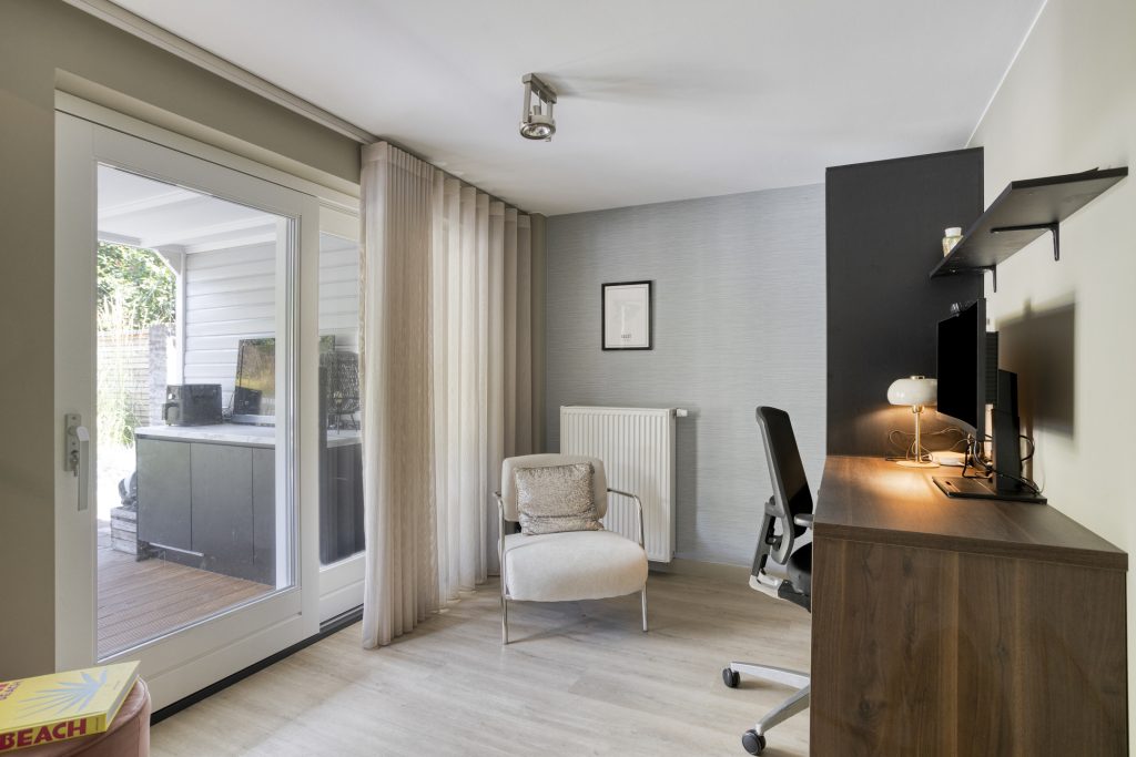 Vanuit de keuken is middels een stalen op maat gemaakte deur de kantoor/hobbyruimte te bereiken. Deze beschikt over een op maat gemaakt bureau en geeft toegang tot het overdekt terras middels een schuifpui. Tevens is de berging te bereiken.