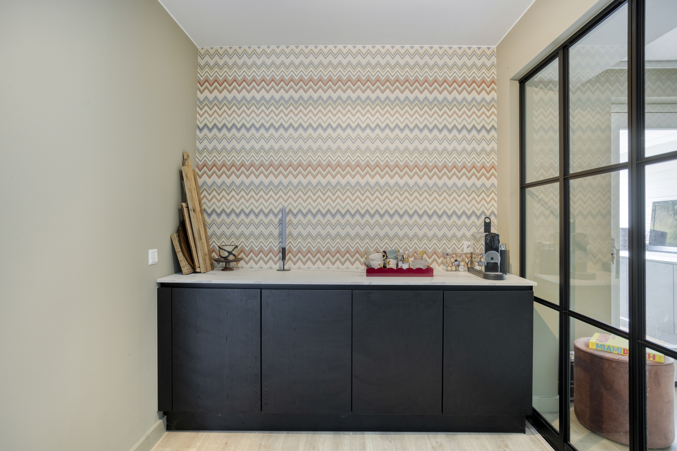 Aan de achterzijde van de keuken bevindt zich in dezelfde fraaie afwerking een gezellige en praktische koffiecorner.
