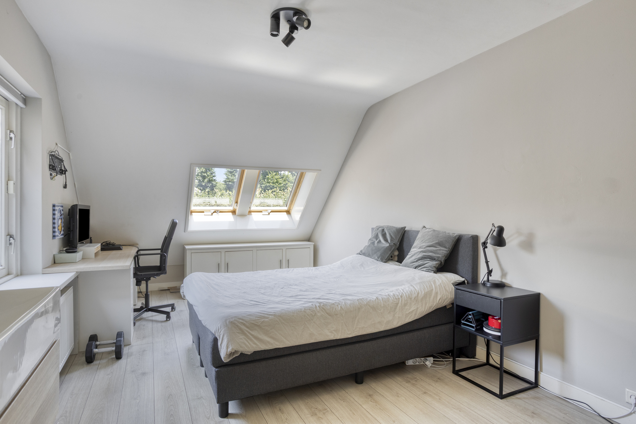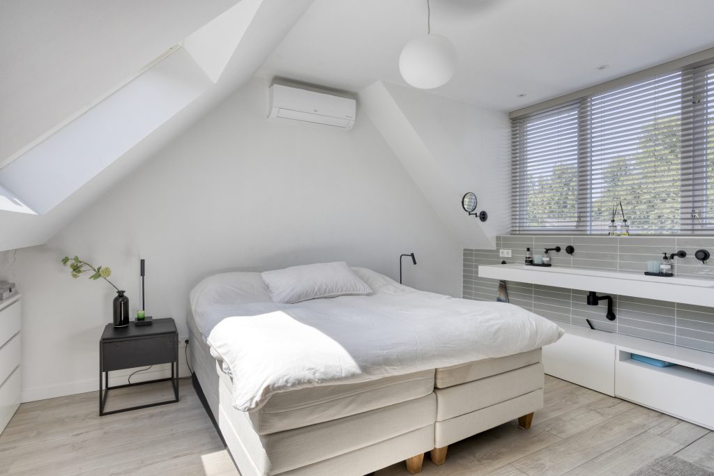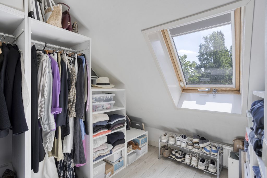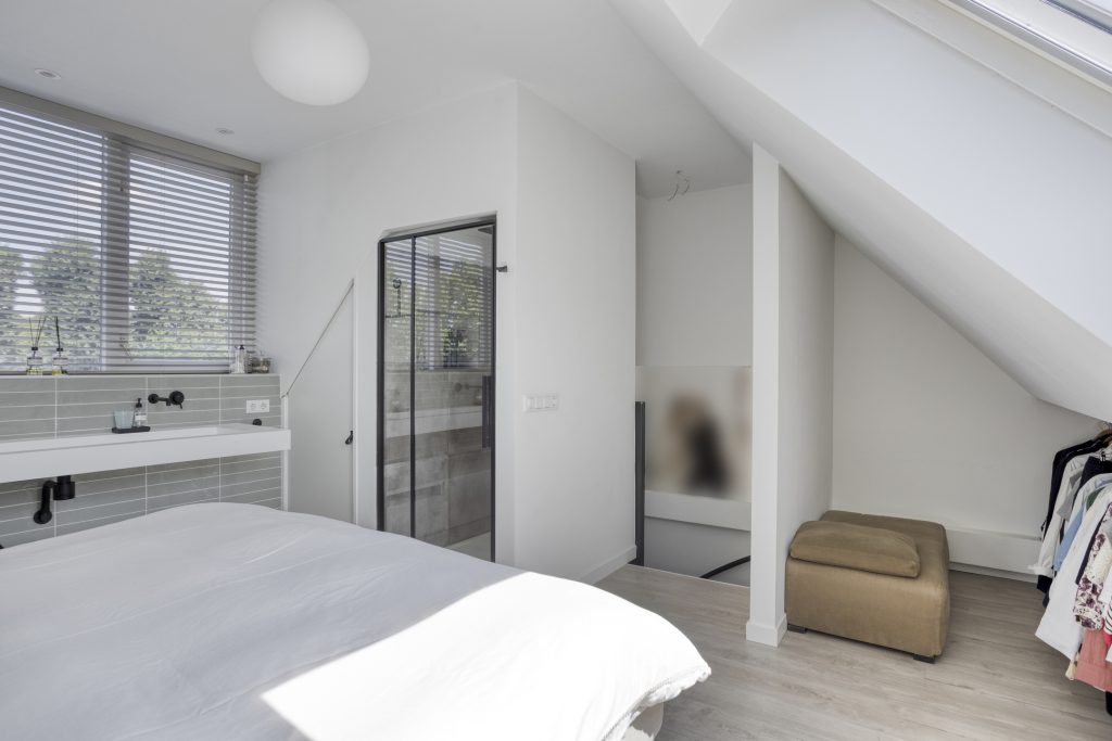 Ruime slaapkamer 1 is gelegen boven het kantoor/berging en beschikt over een vaste wastafel, een zijraam en 2x een Velux dakraam. Toegang tot de ruime inloopkamer met een groot Velux dakraam.