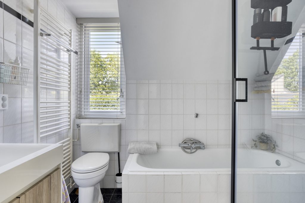Nette betegelde badkamer is voorzien van een wastafel in meubel, douchecabine, ligbad en toilet.