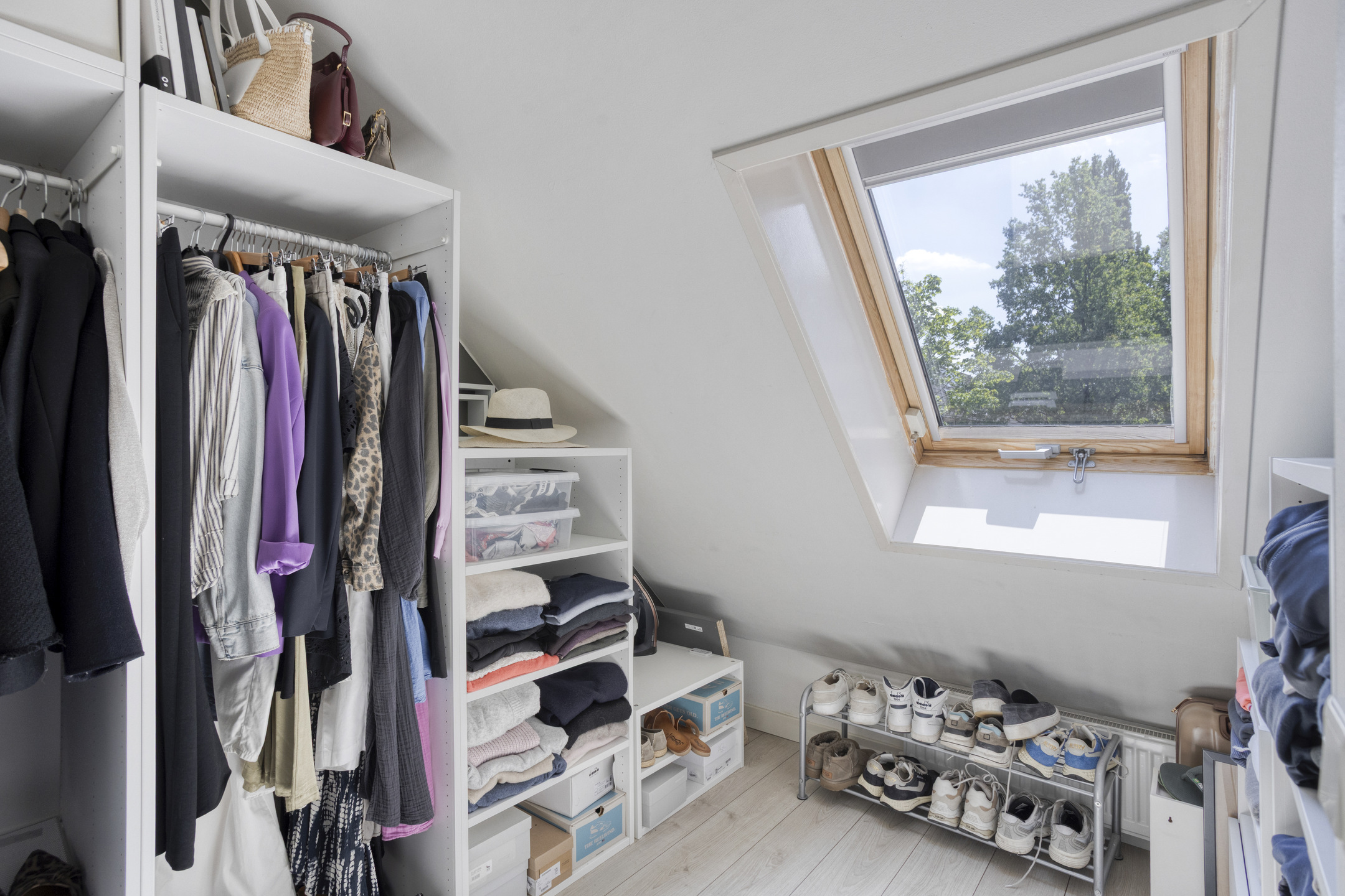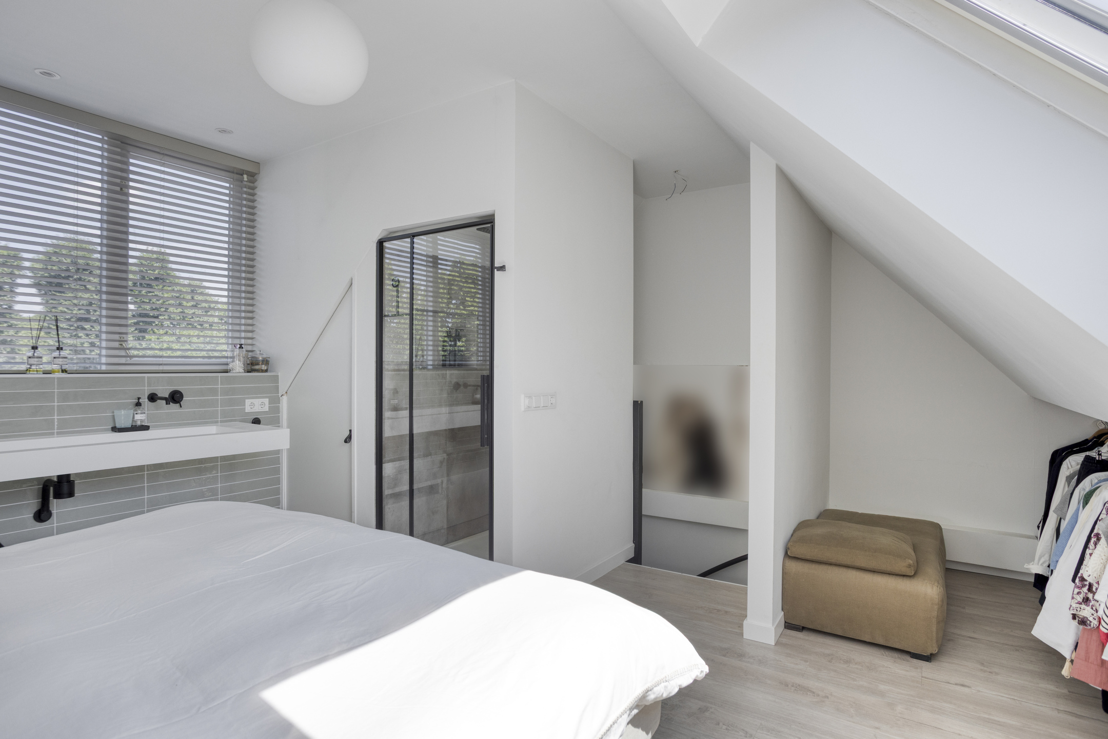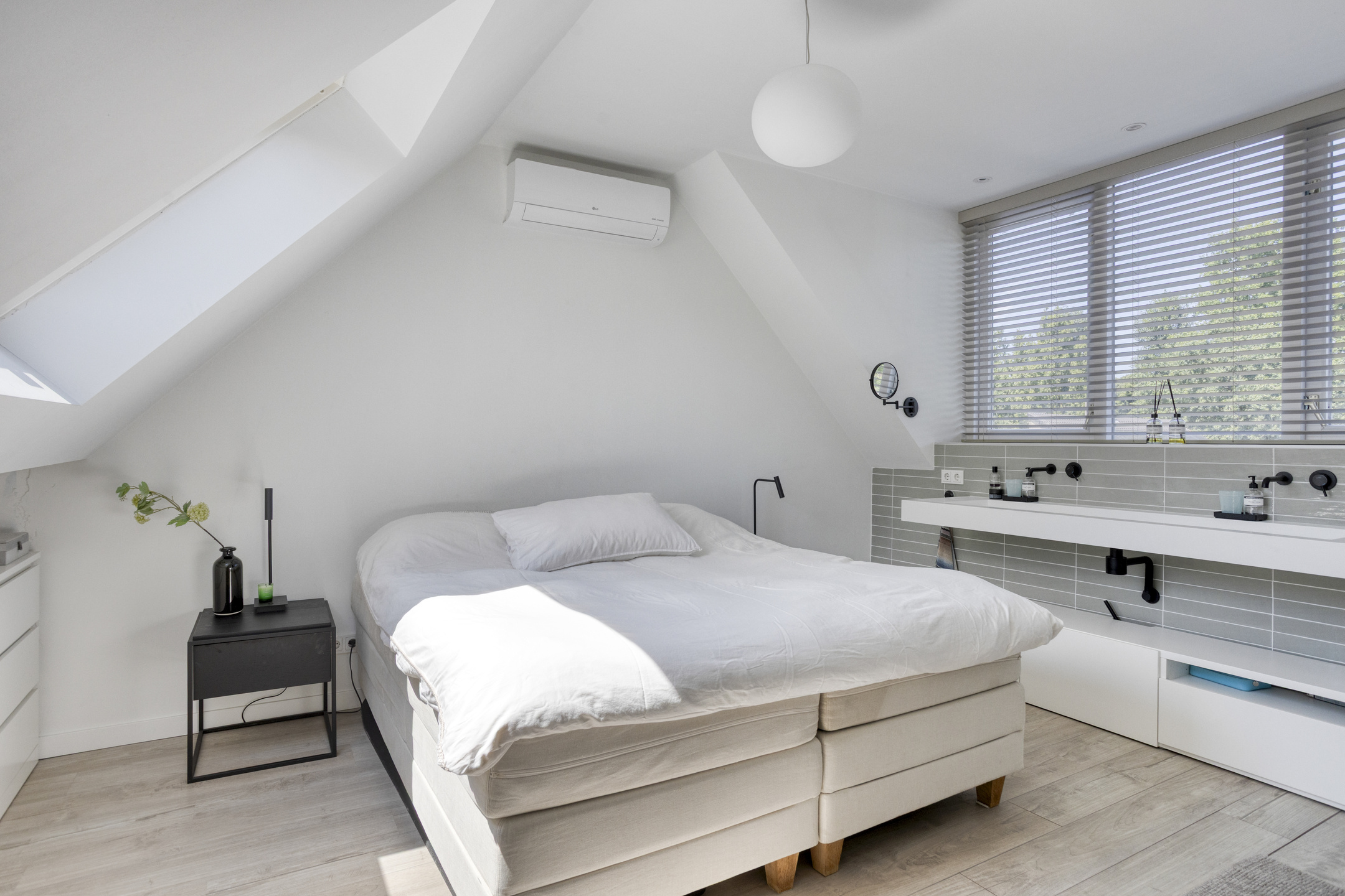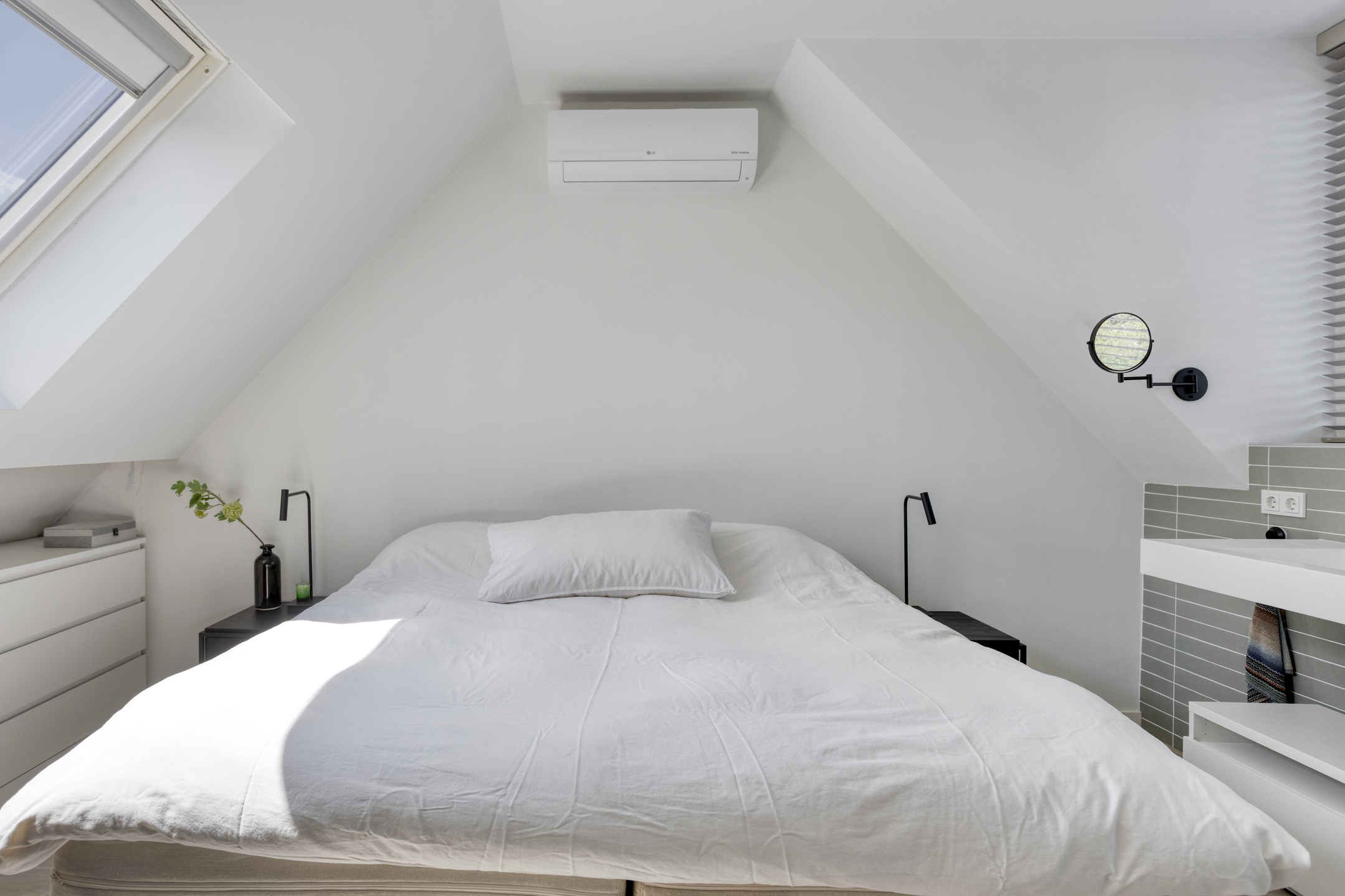 Middels vaste trap te bereiken. Fijne royale slaapkamer 5 met aan de ene zijde een groot dakraam en aan de andere zijde een dakkapel (2018) over de gehele breedte van de kamer. Deze slaapkamer beschikt over een laminaatvloer en een groot wastafel meubel met 2 kranen en geeft toegang tot de stookruimte en inloopdouche met stalen deur en rain shower. De CV-installatie Remeha Avanta 35C is van 2010.
