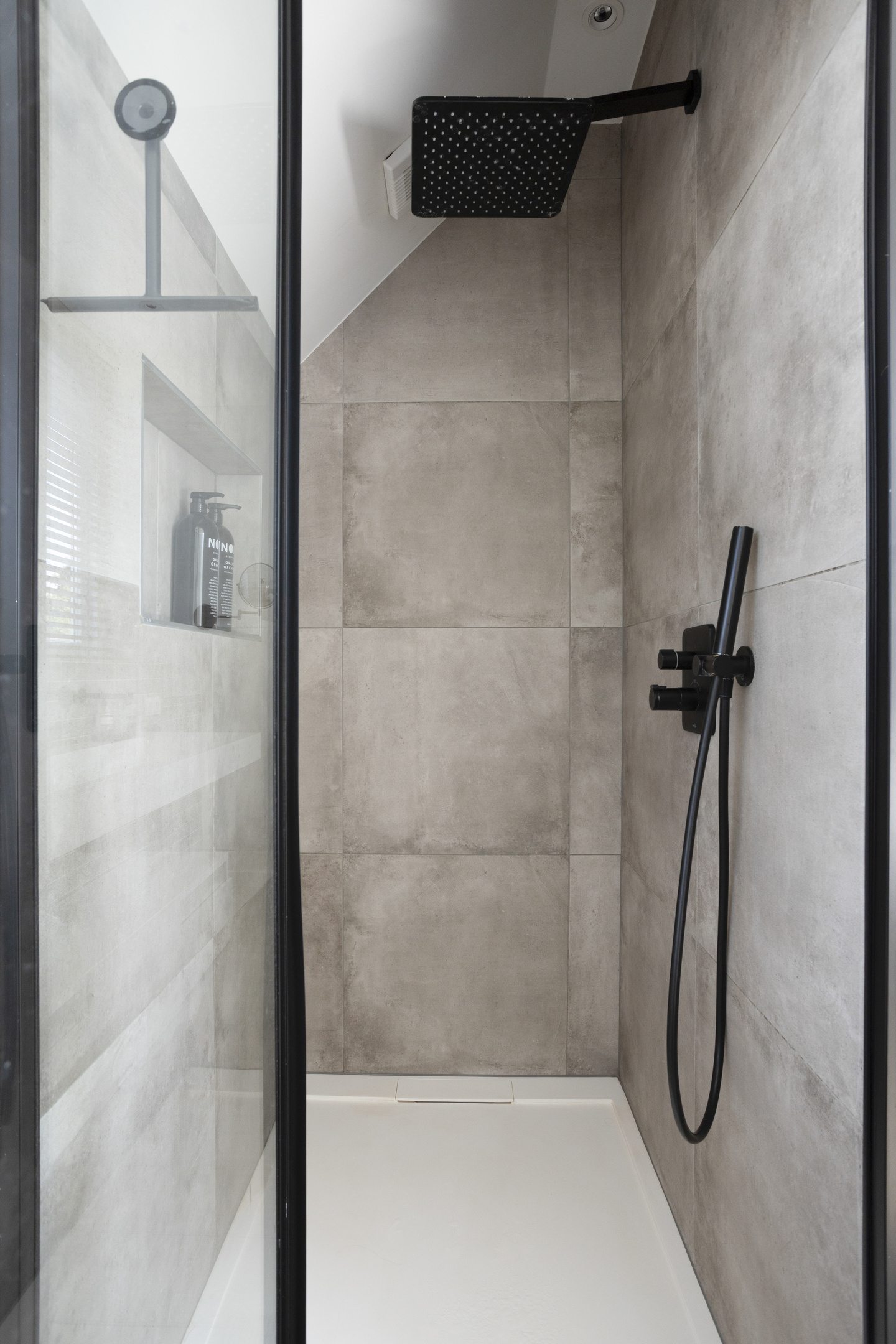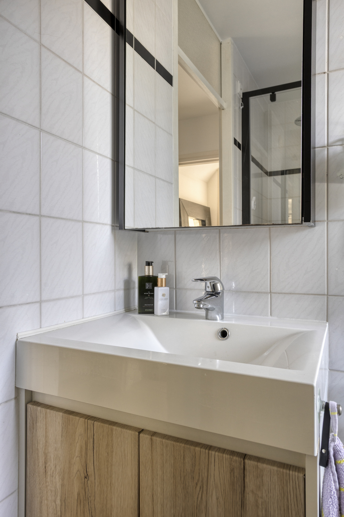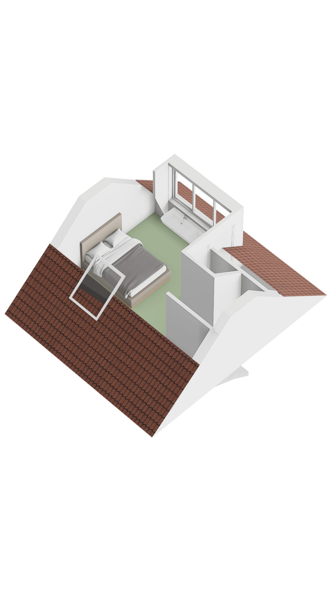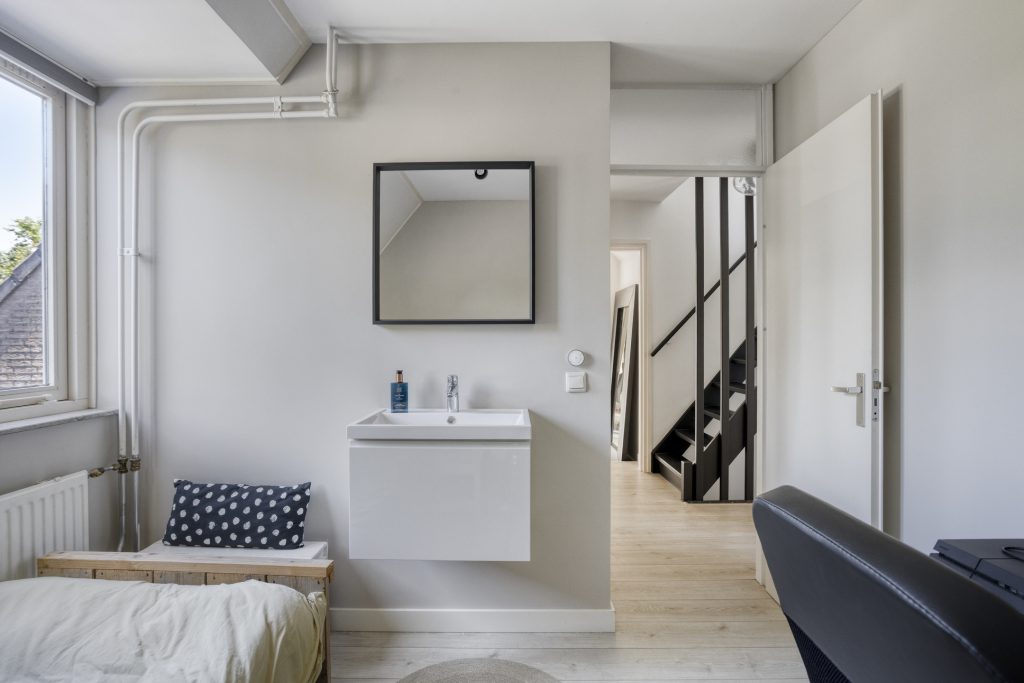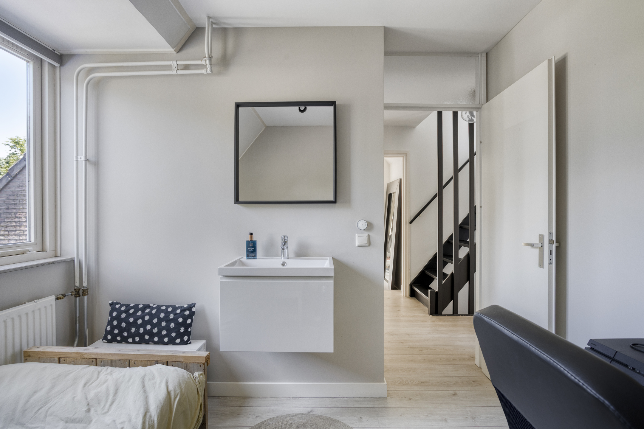 Middels vaste trap te bereiken. Fijne royale slaapkamer 5 met aan de ene zijde een groot dakraam en aan de andere zijde een dakkapel (2018) over de gehele breedte van de kamer. Deze slaapkamer beschikt over een laminaatvloer en een groot wastafel meubel met 2 kranen en geeft toegang tot de stookruimte en inloopdouche met stalen deur en rain shower. De CV-installatie Remeha Avanta 35C is van 2010.