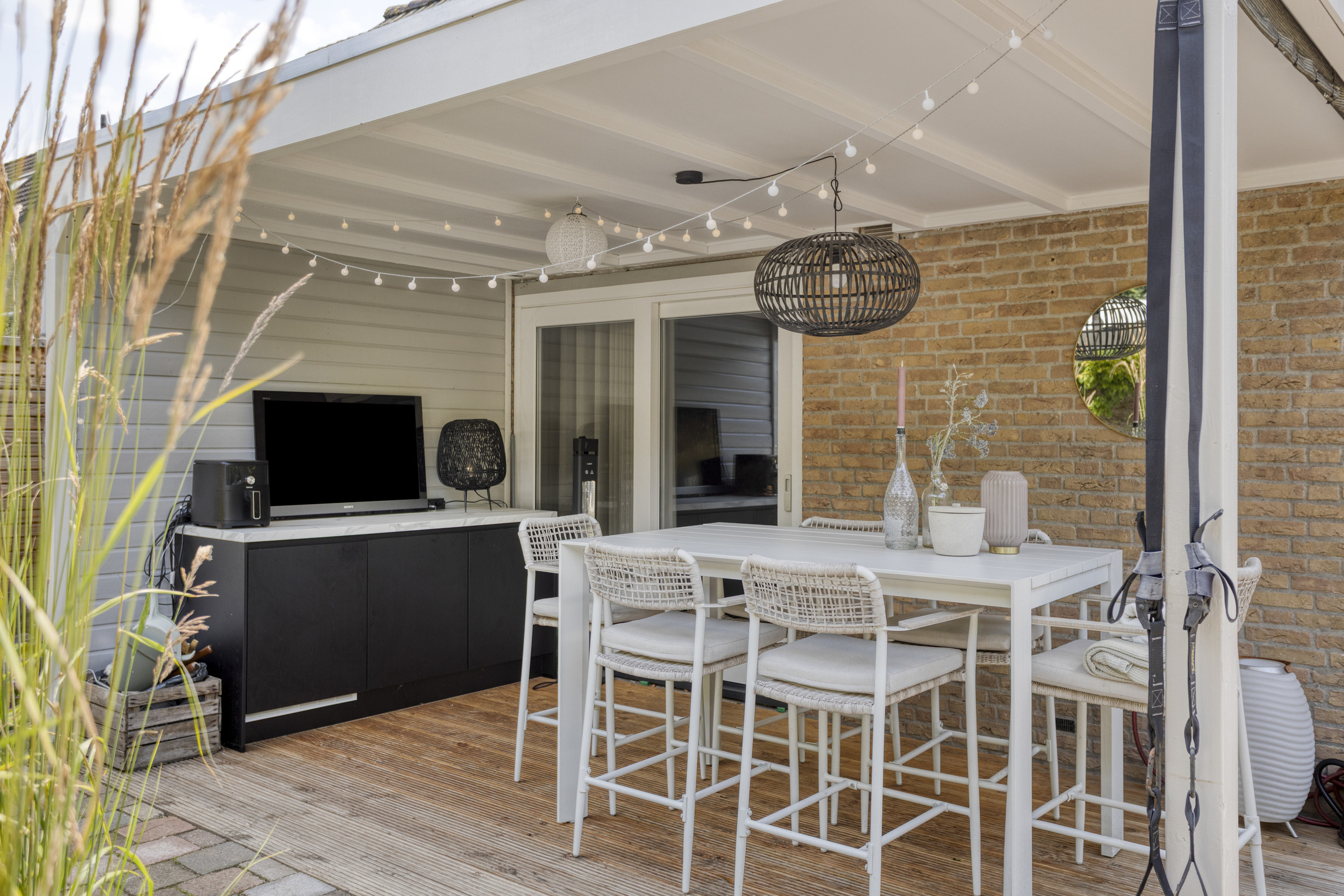 Het overdekt terras is voor een groot gezin tevens een heerlijke chill plek voor groot en klein; en met de buitenkeuken als extra item, kan men hier zelfs in de winter goed vertoeven.