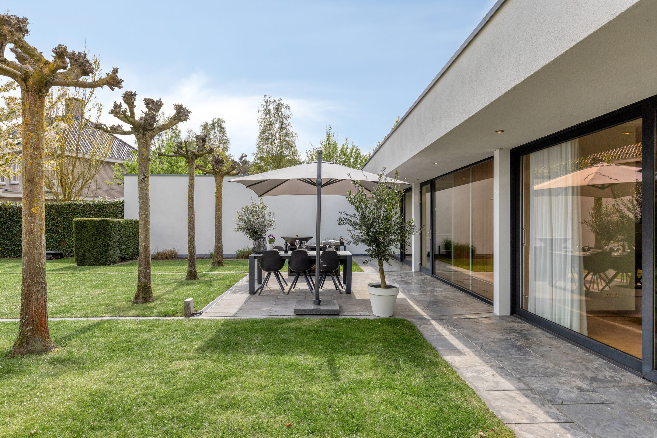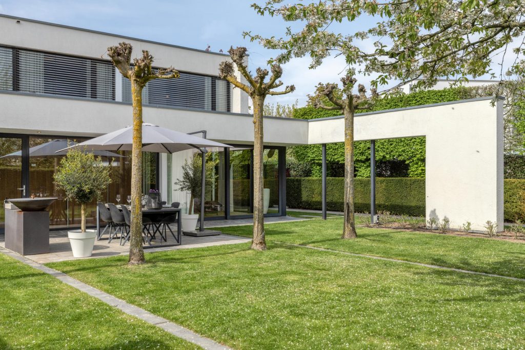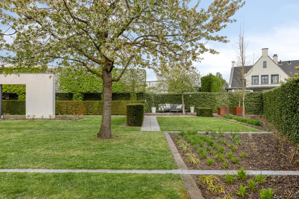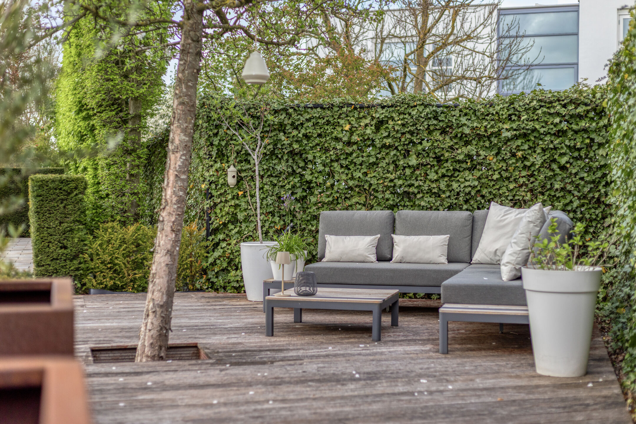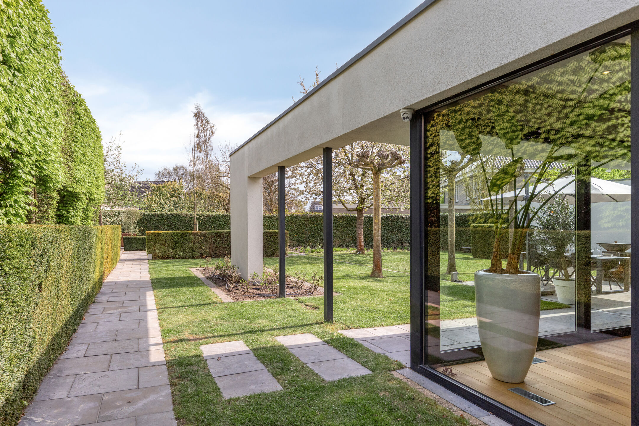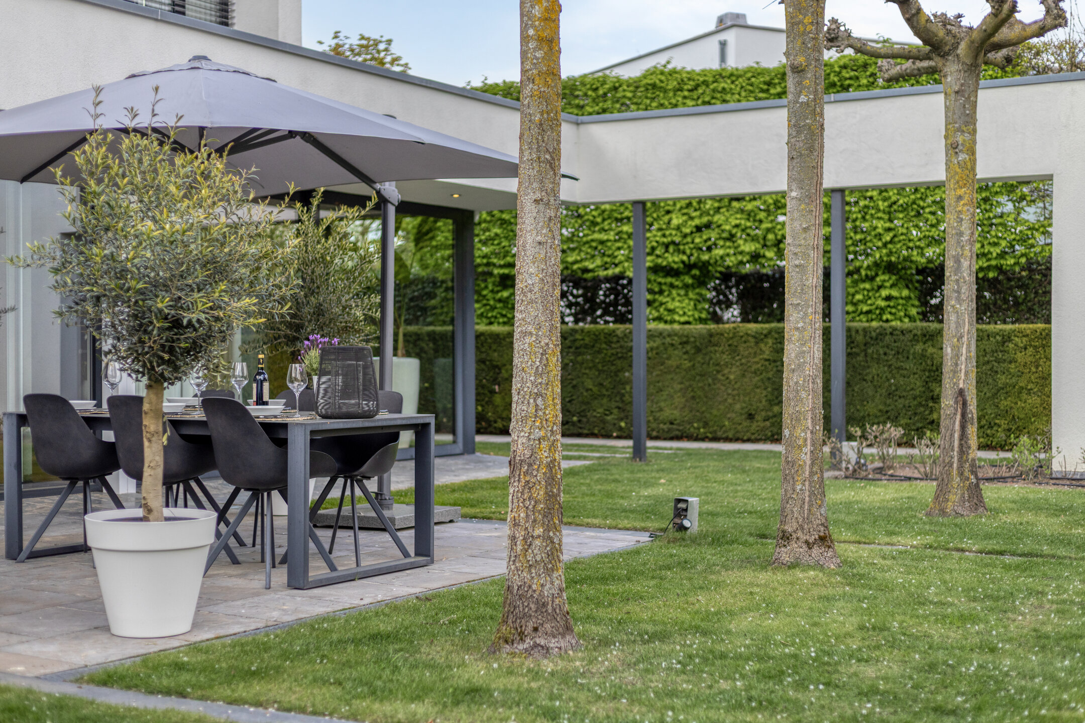 De tuin is onder architectuur aangelegd, ligt op het zuiden en voelt als een privéresort: volwassen beplanting, optimale privacy, een strak gazon en meerdere terrassen – waaronder een houten vlonderterras voor lange zomeravonden.