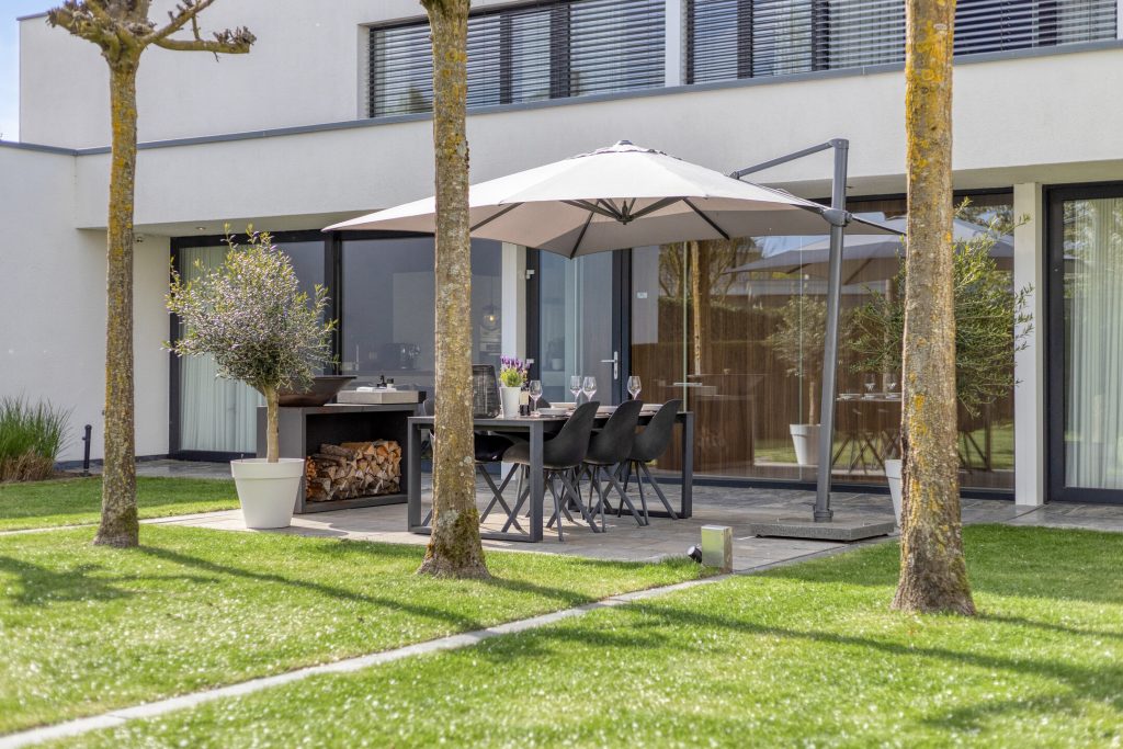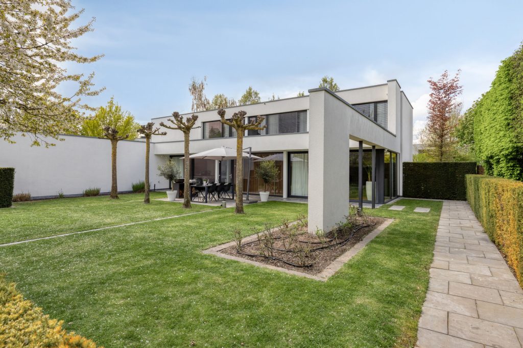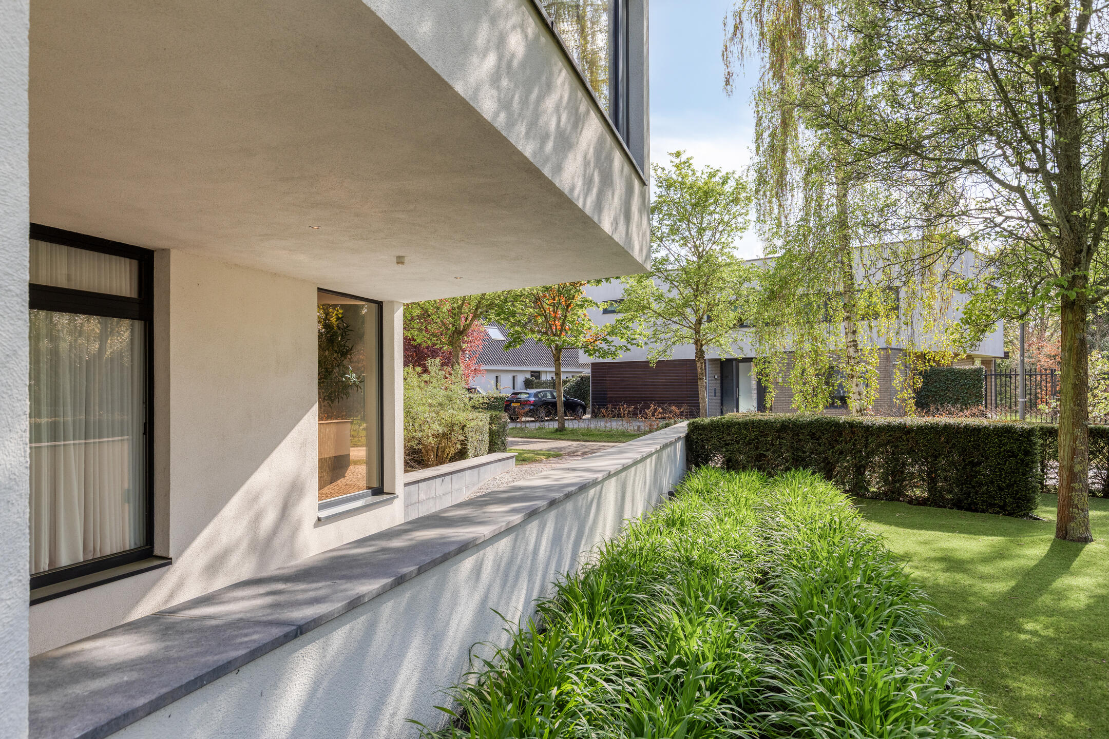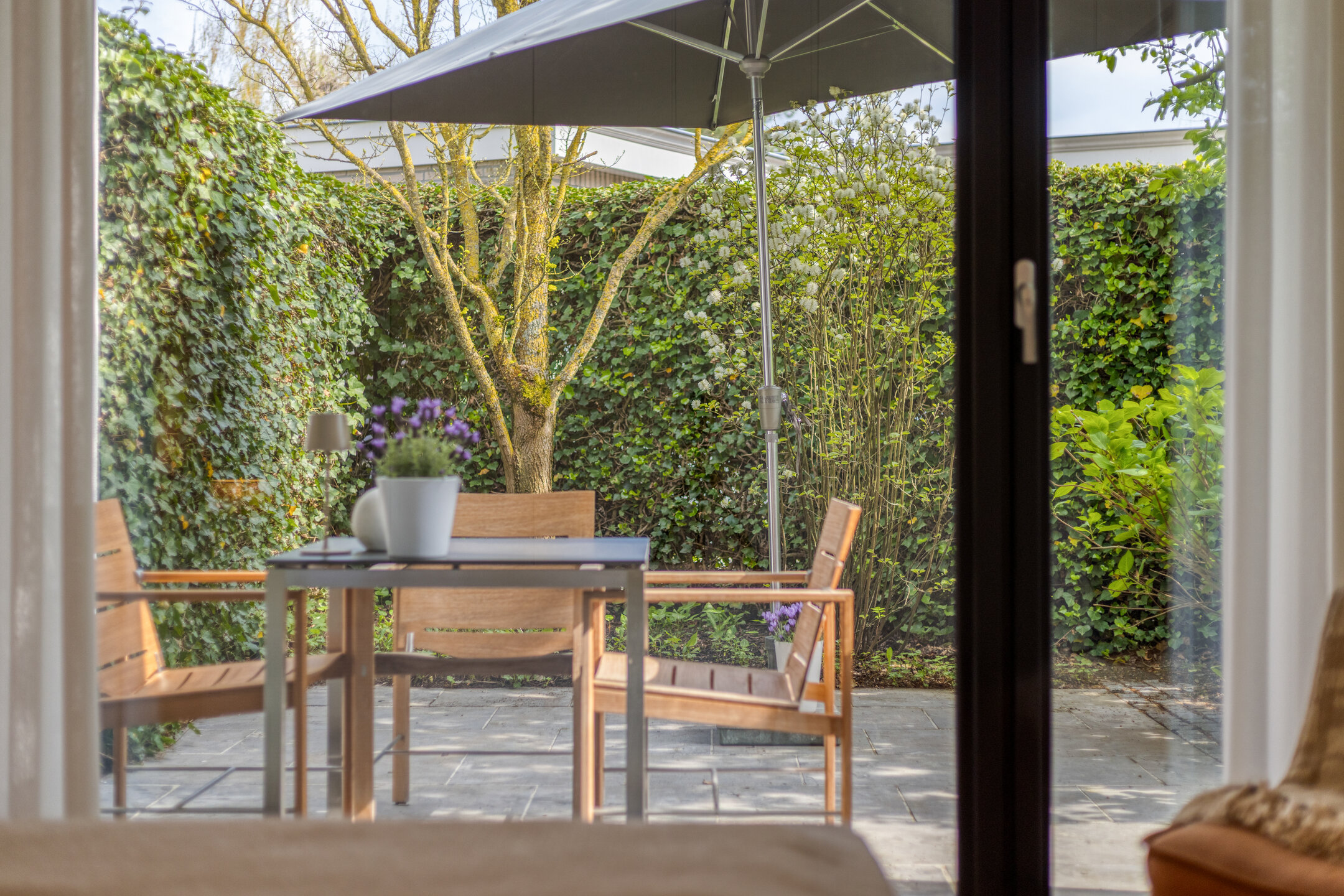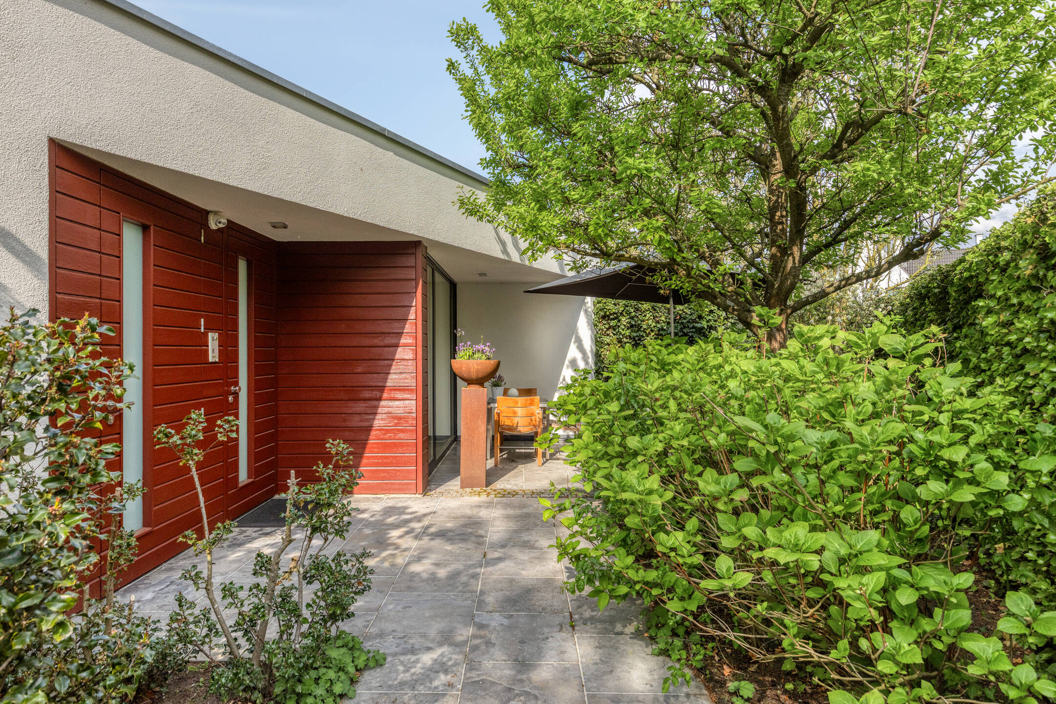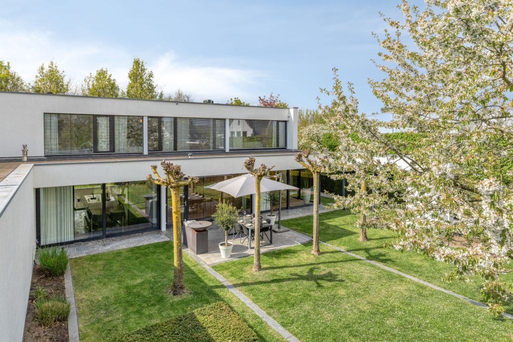 De tuin is onder architectuur aangelegd, ligt op het zuiden en voelt als een privéresort: volwassen beplanting, optimale privacy, een strak gazon en meerdere terrassen – waaronder een houten vlonderterras voor lange zomeravonden.