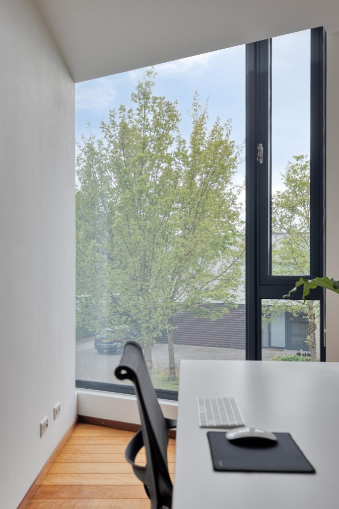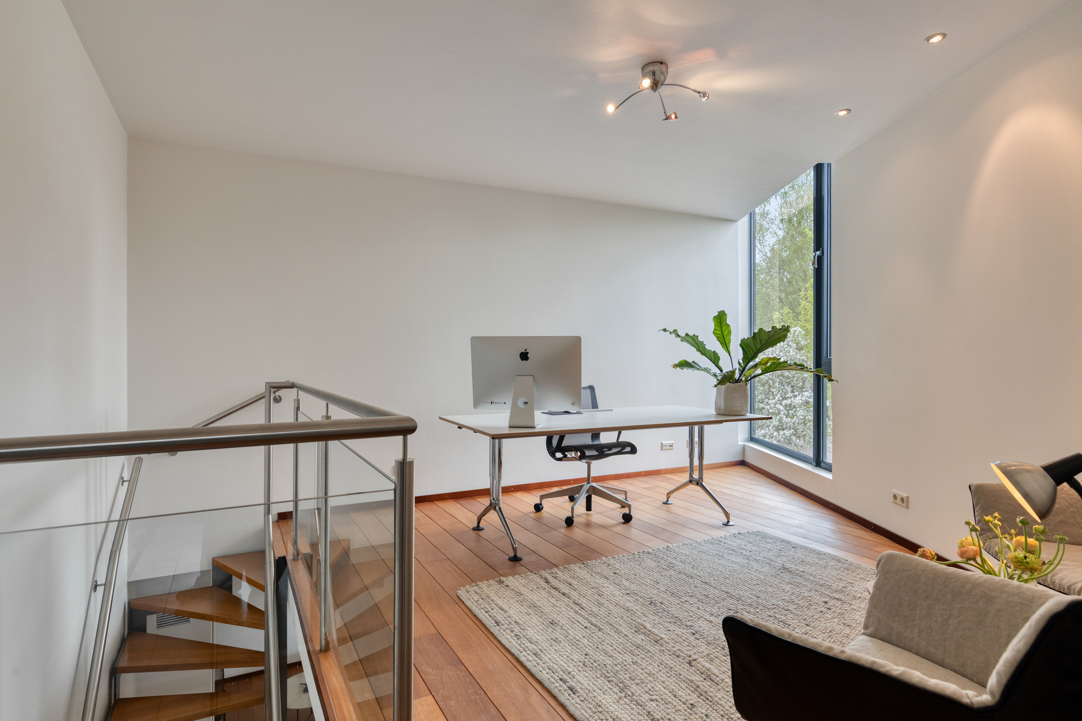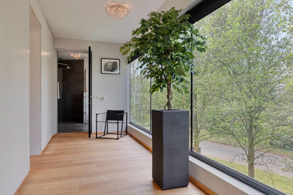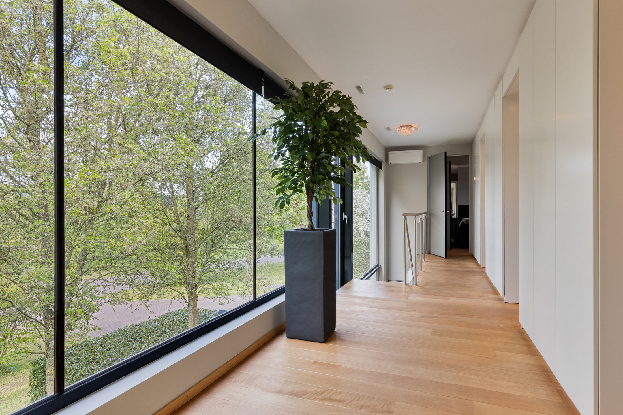 • Boven is de architectuur opnieuw voelbaar: de overloop/gang biedt aan één zijde toegang tot slaapkamers en badkamers, terwijl de andere zijde volledig van glas is.