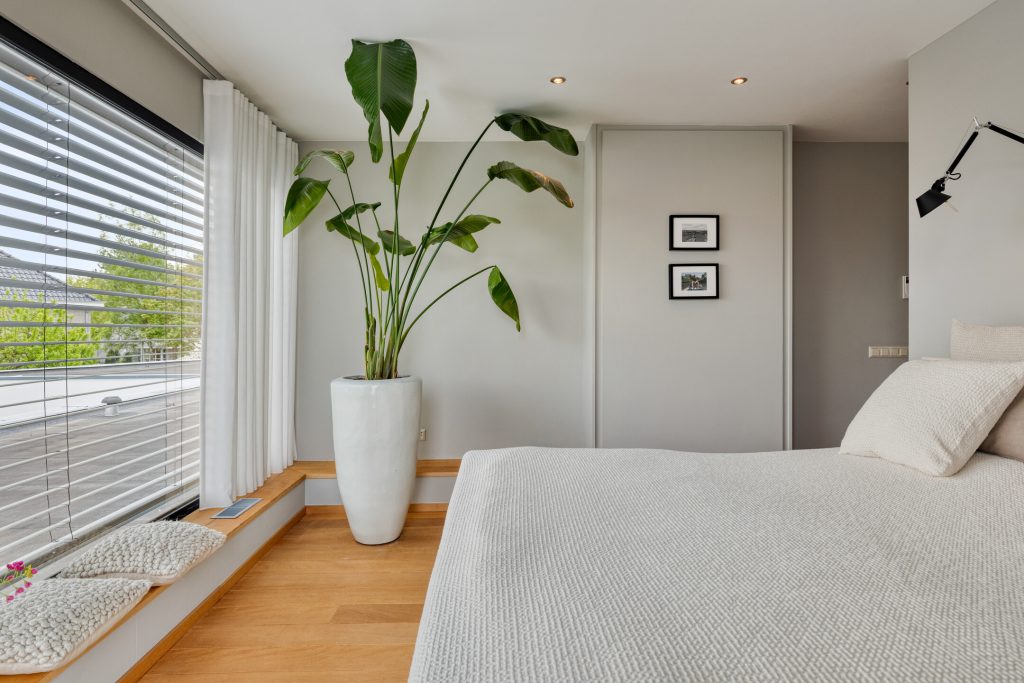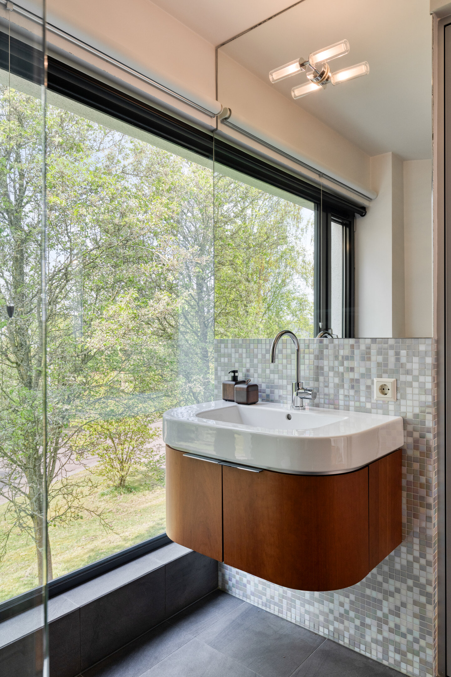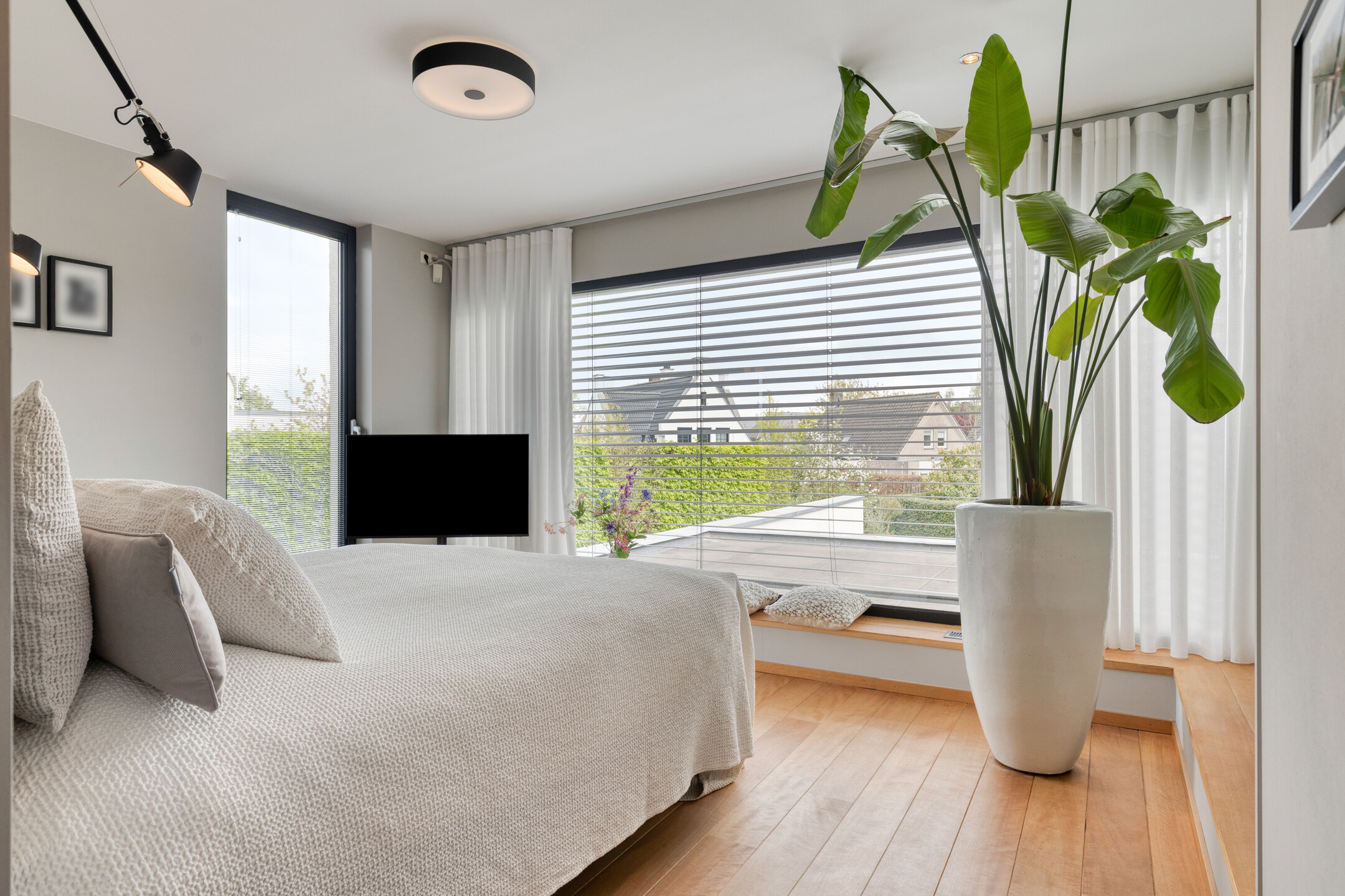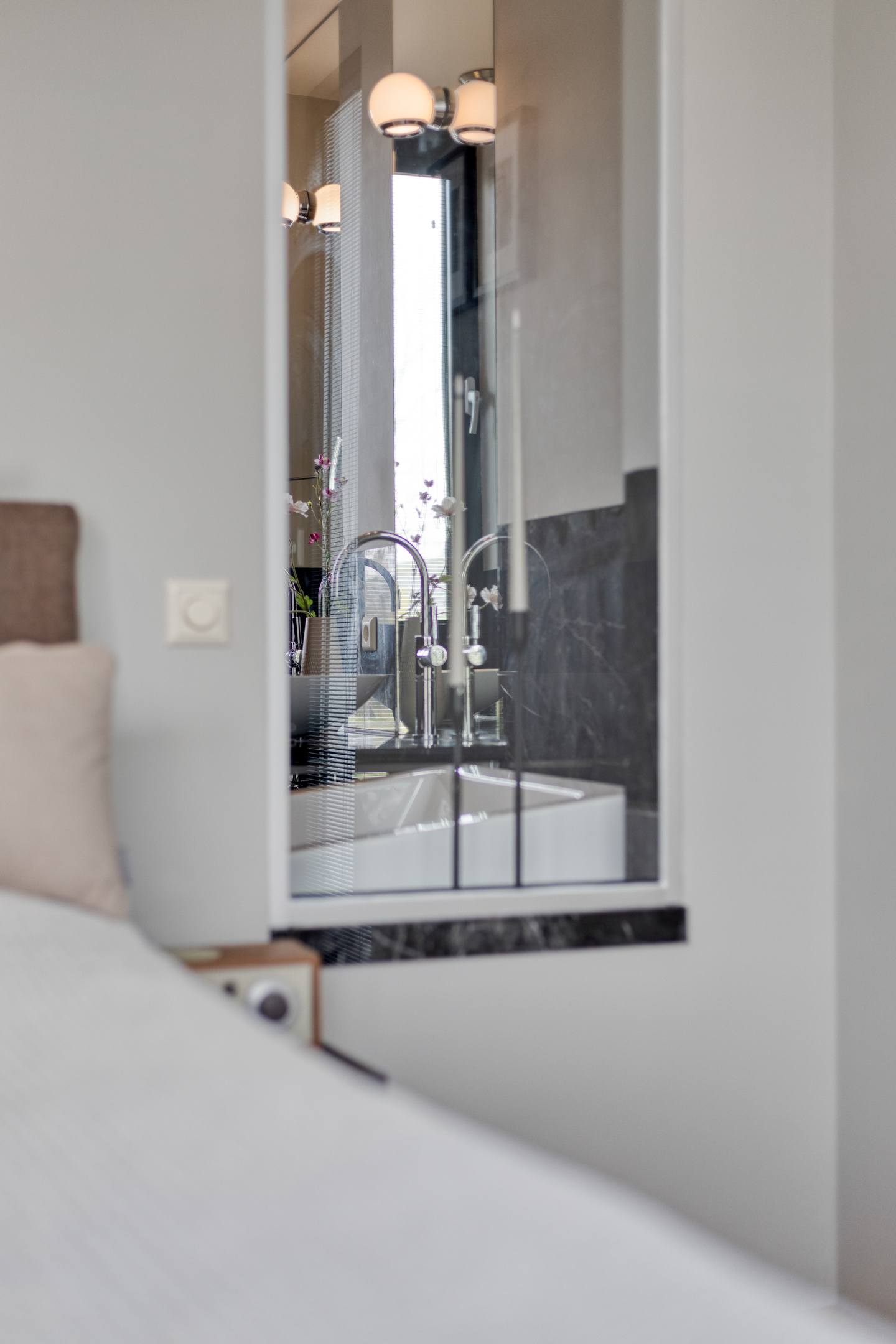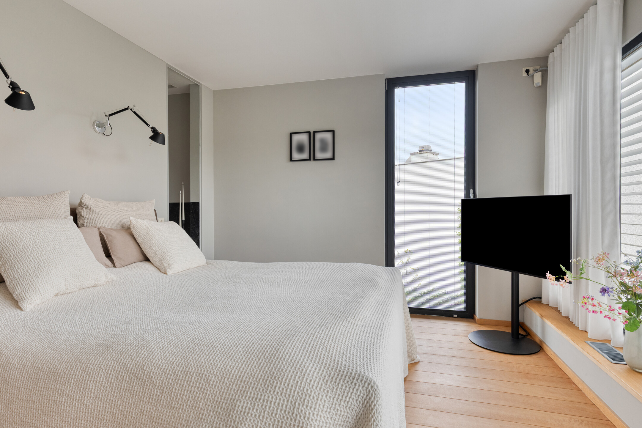 • Een bijzonder detail: via een binnenraam in de badkamer kijkt u naar de slaapkamer én is er doorzicht naar buiten.