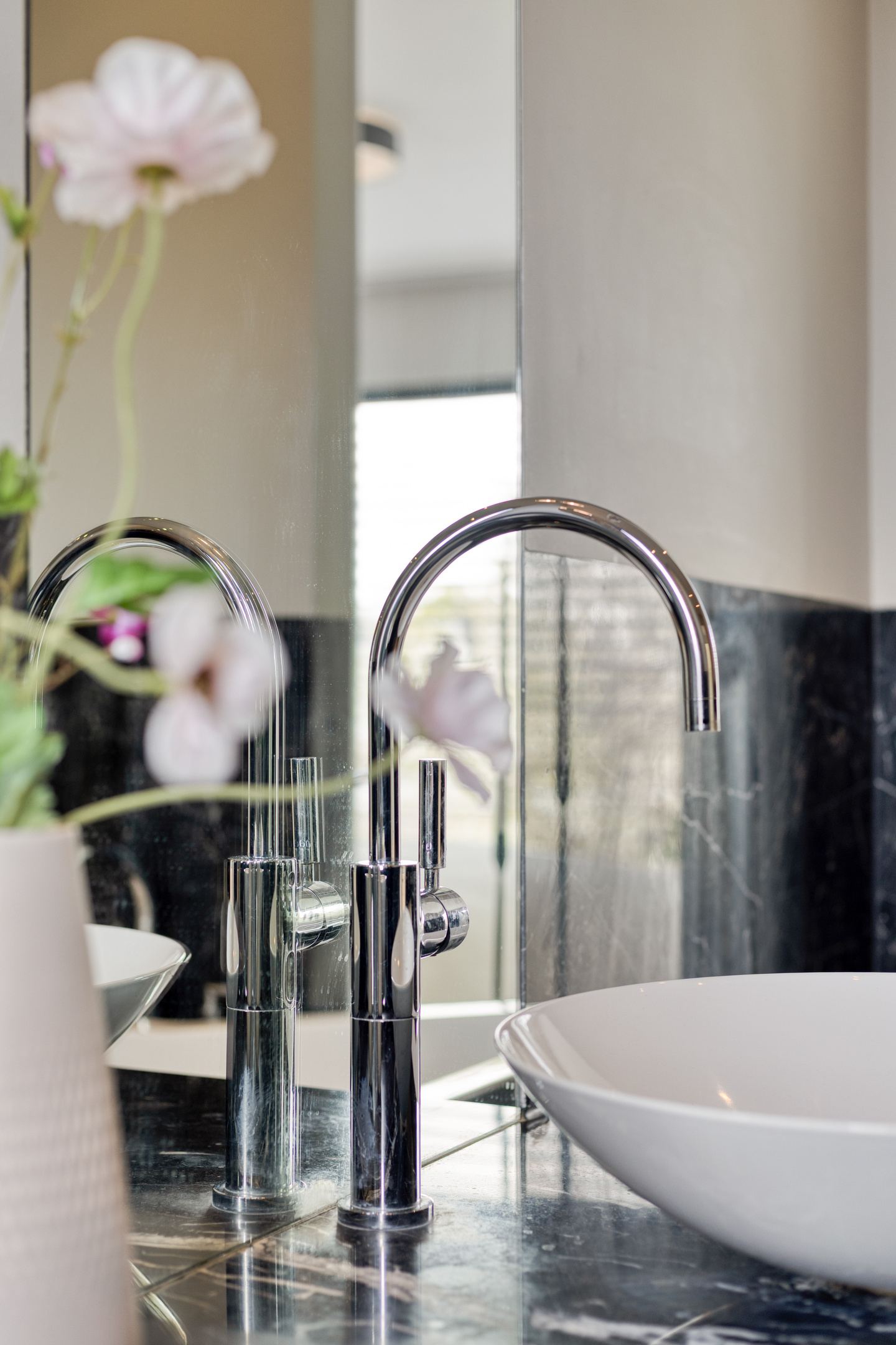 • Grote spoelbak in het werkblad met Grohe Blue bruiswaterkraan.