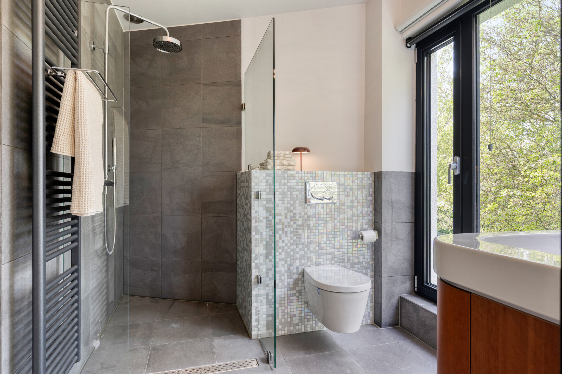 • De kinderbadkamer is praktisch en fris, met inloopdouche, toilet en wastafelmeubel – en geeft bovendien toegang tot de multifunctionele aanleunwoning van 117 m2.