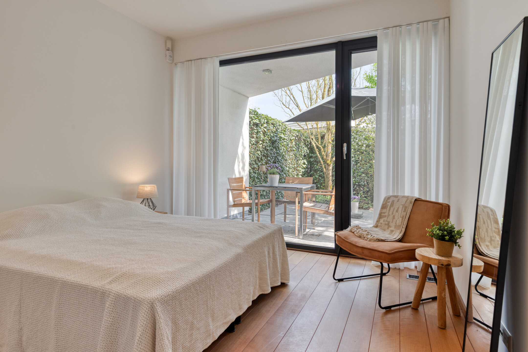 • Riante slaapkamer met houten vloer, inbouwkastenwand en deur naar een extra terras.
