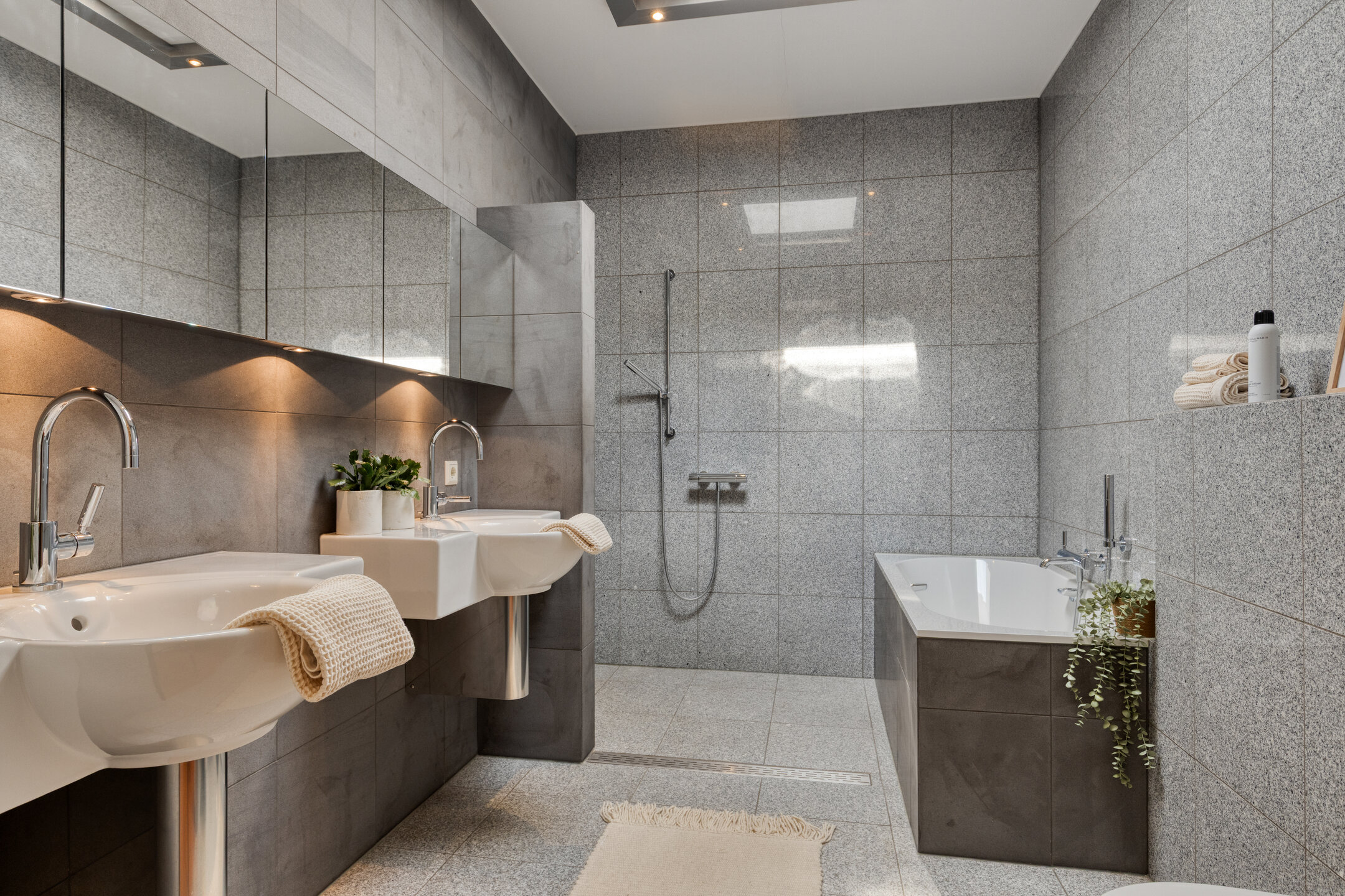 • Badkamer volledig in hardstenen tegelwerk met inloopdouche, bad, 2 wastafels met badmeubel en toilet.