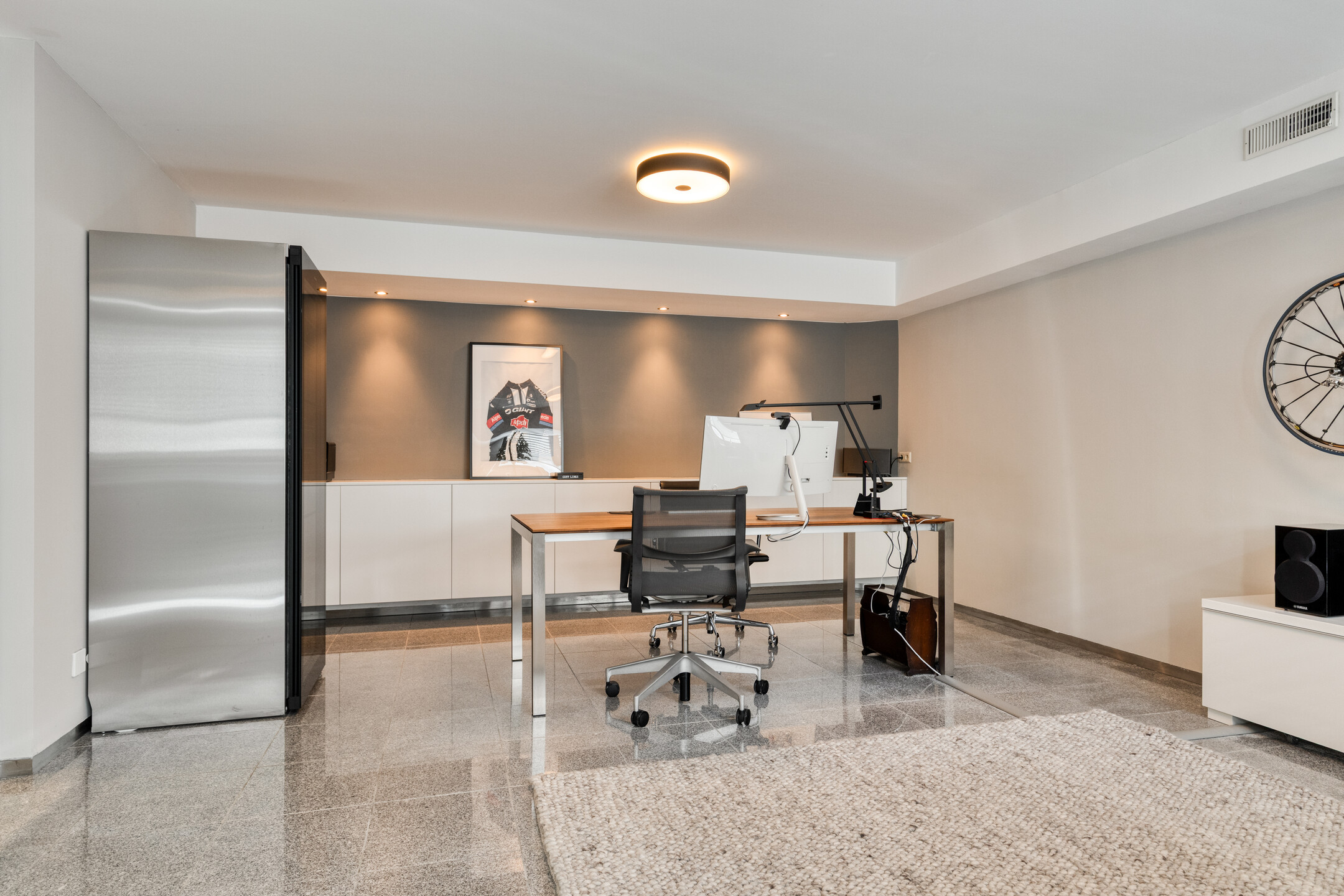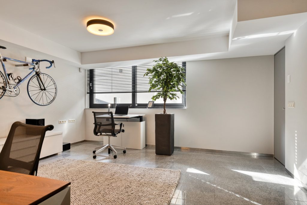 • Werken in alle rust: een hoogwaardig kantoor met hardstenen vloer en vloerverwarming. Dankzij de grote raampartij is er veel daglicht en ruimte voor meerdere werkplekken, met inbouwkasten.