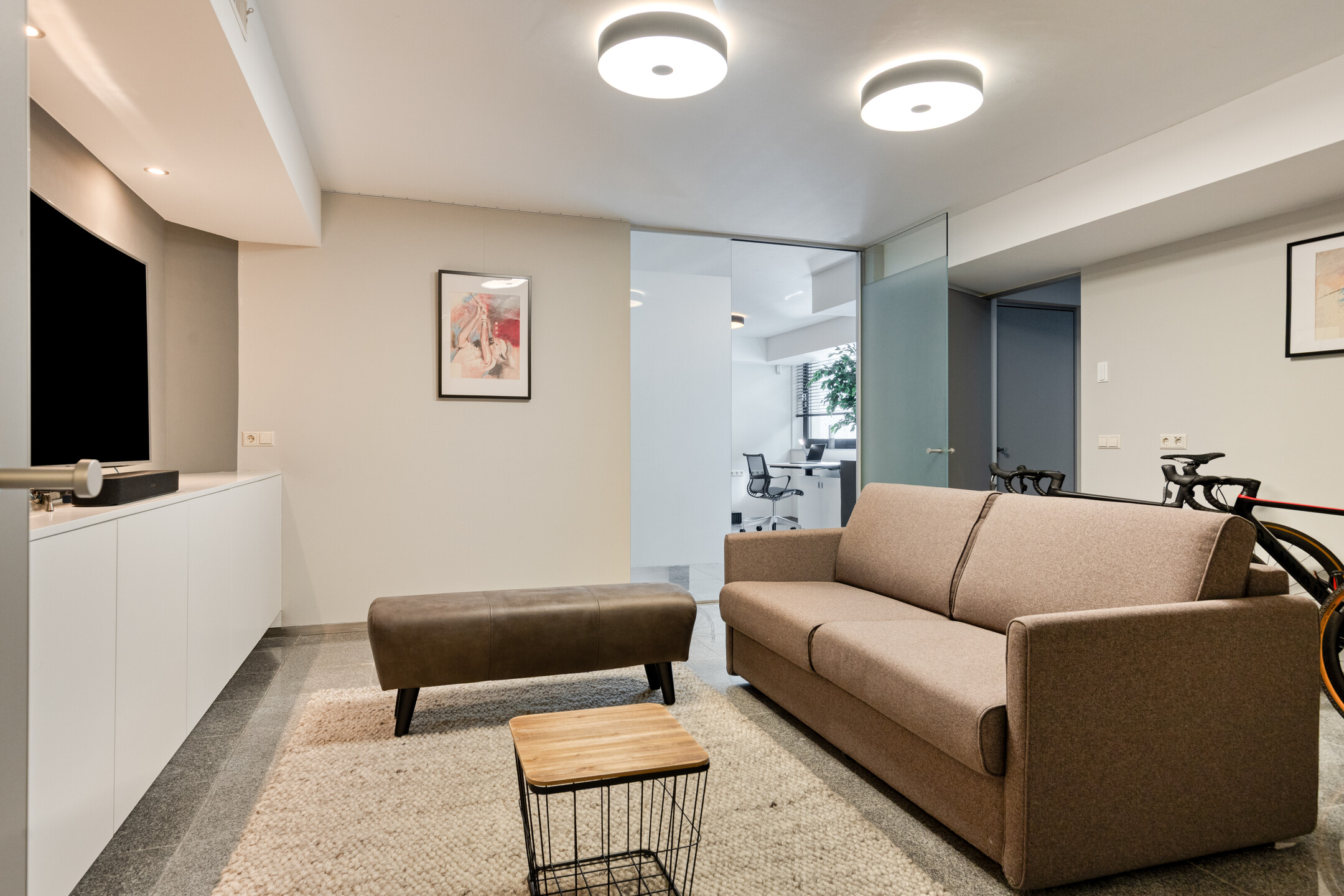• In de centrale ruimte (nu ingericht als lounge-/chillruimte) zorgen inbouwkasten voor een strak en opgeruimd geheel.