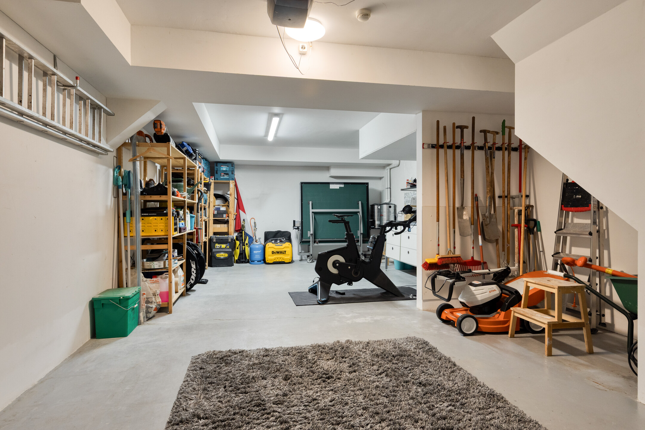• De inpandige garage is royaal en compleet: elektrisch bedienbare garagedeur, directe toegang tot een 2e oprit, een wastafel met fontein, keukenblok en een centraal stofzuigsysteem (Astrovac, vernieuwd in 2020).