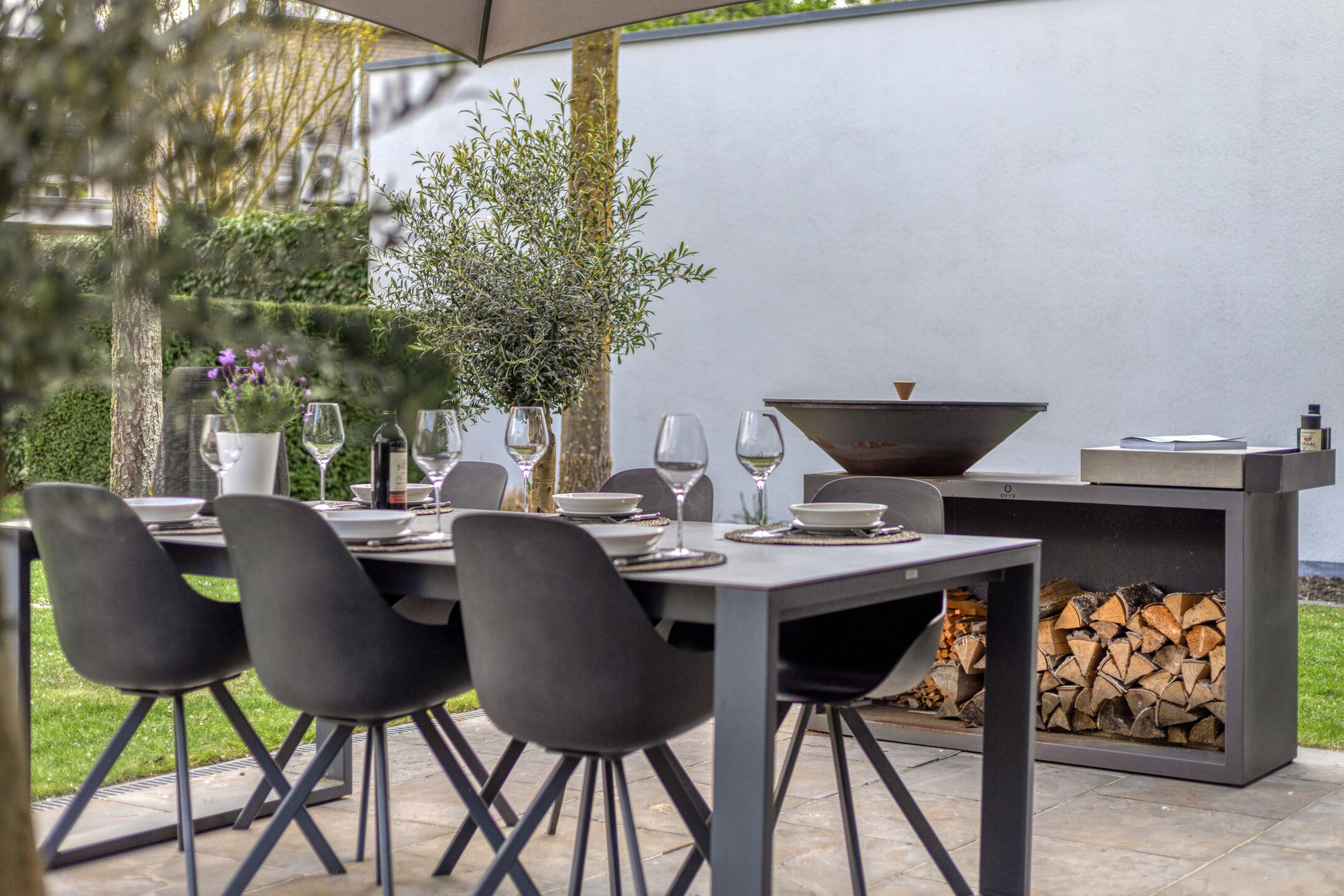 • In de eetkamer loopt alles moeiteloos over naar de luxe Arclinea Convivium woonkeuken, met een grote schuifpui richting de tuin.