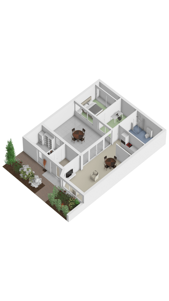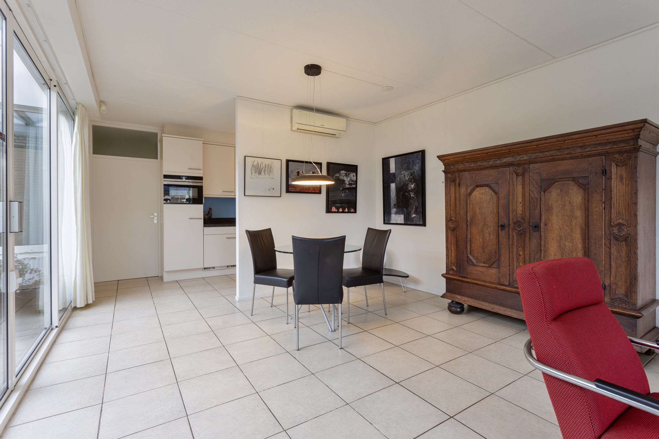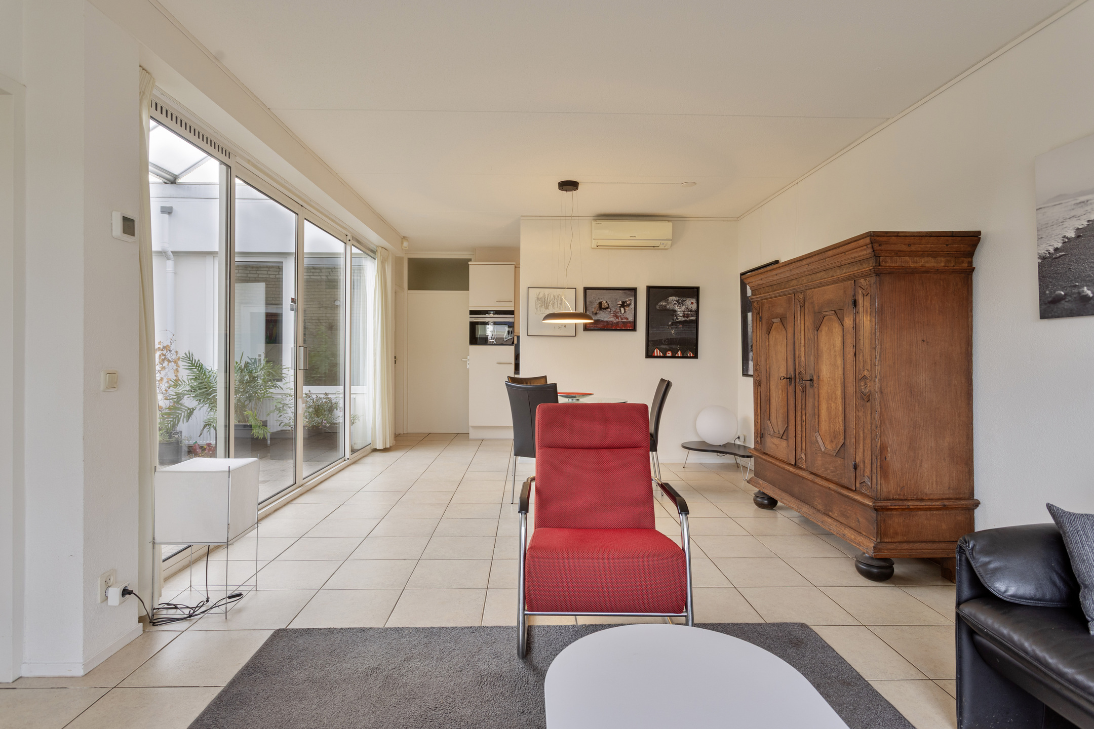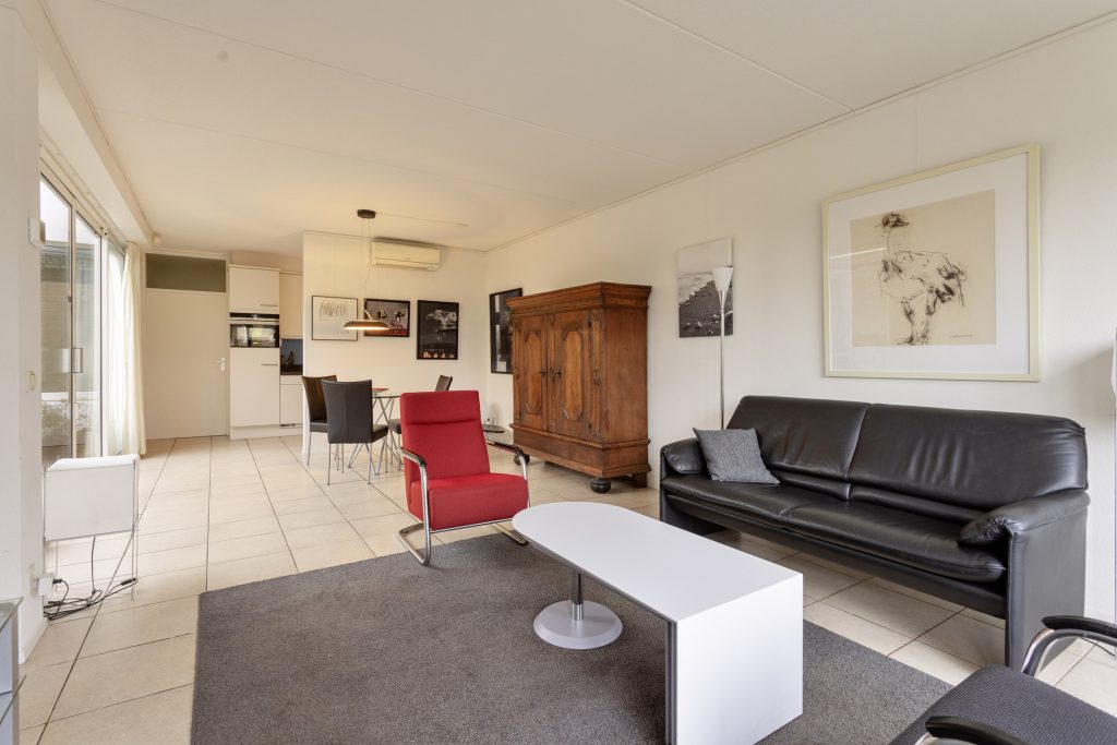 The entrance leads into a spacious hall. To the left is a practical storage room, and to the right of the hall is the spacious living room. The storage room features a tiled floor, connections for a washing machine and dryer, the central heating boiler and underfloor heating unit, the solar panel inverter, and a door leading to the patio. There is also ample space here for storing bicycles, for example. The spacious and inviting living room features tiled flooring with underfloor heating and is bathed in light thanks to the large windows overlooking the park. Sliding doors lead to the patio. This neatly paved patio features an insulated, electrically operated folding roof and radiators, allowing you to use this wonderful extra space year-round. In the summer, it’s a wonderful place to relax in peace and privacy.