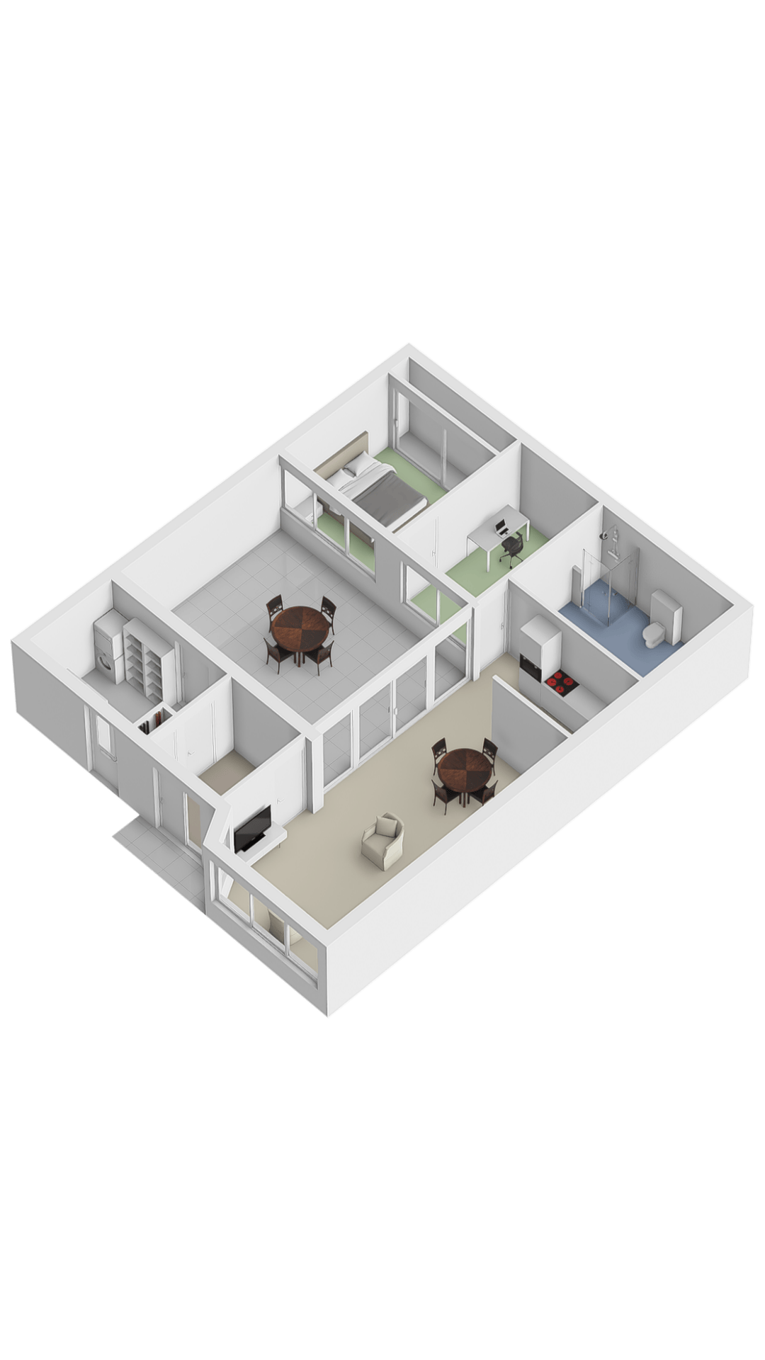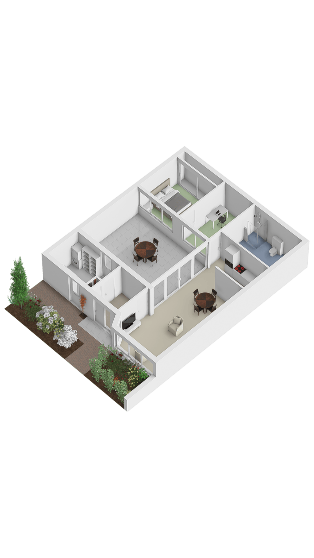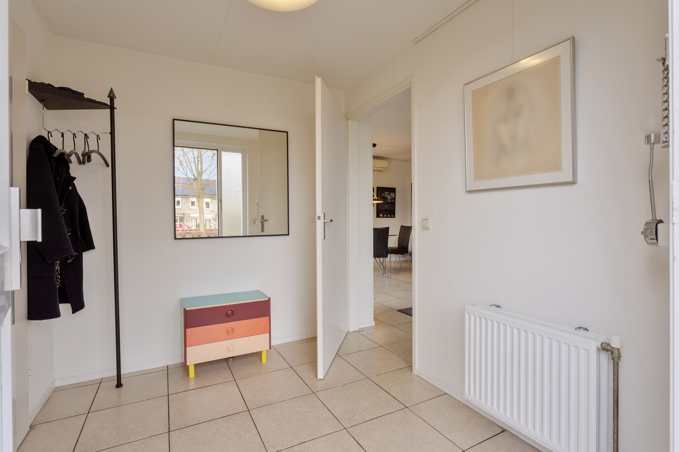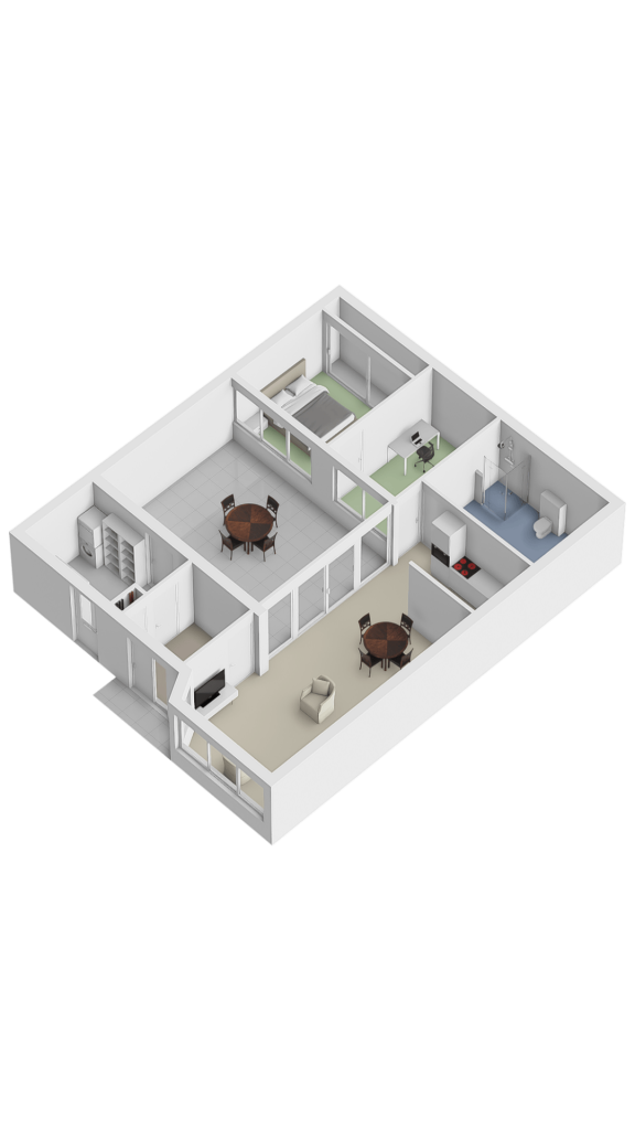 The entrance leads into a spacious hall. To the left is a practical storage room, and to the right of the hall is the spacious living room. The storage room features a tiled floor, connections for a washing machine and dryer, the central heating boiler and underfloor heating unit, the solar panel inverter, and a door leading to the patio. There is also ample space here for storing bicycles, for example. The spacious and inviting living room features tiled flooring with underfloor heating and is bathed in light thanks to the large windows overlooking the park. Sliding doors lead to the patio. This neatly paved patio features an insulated, electrically operated folding roof and radiators, allowing you to use this wonderful extra space year-round. In the summer, it’s a wonderful place to relax in peace and privacy.