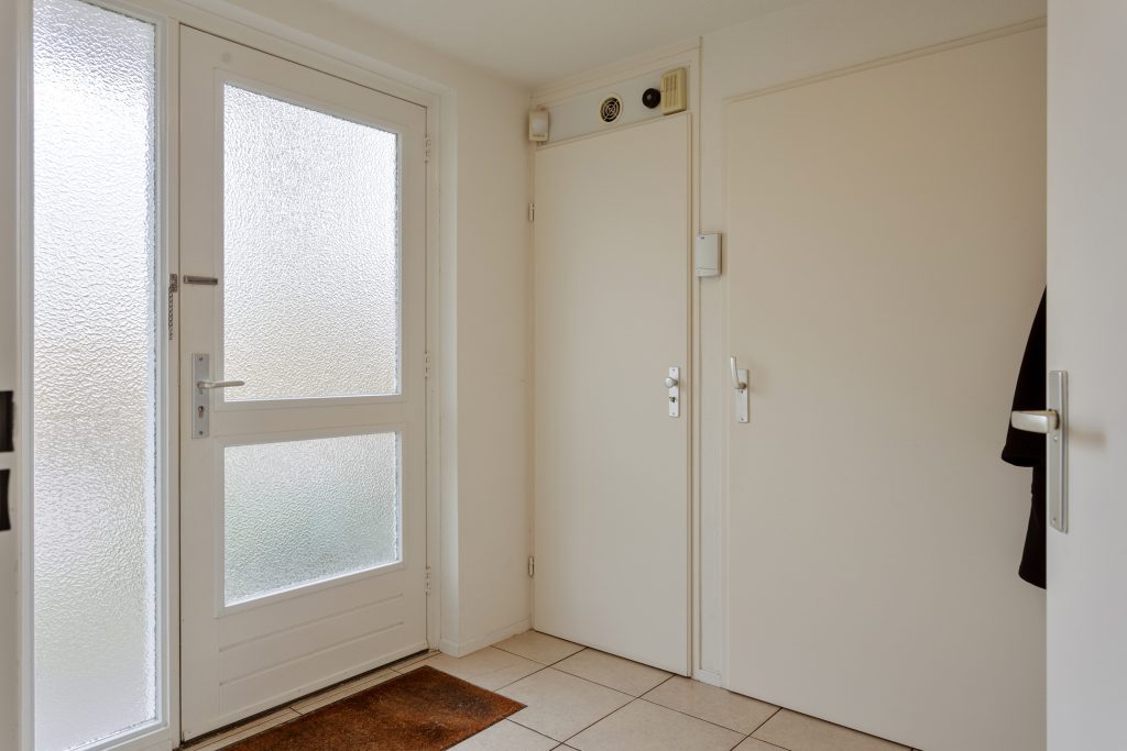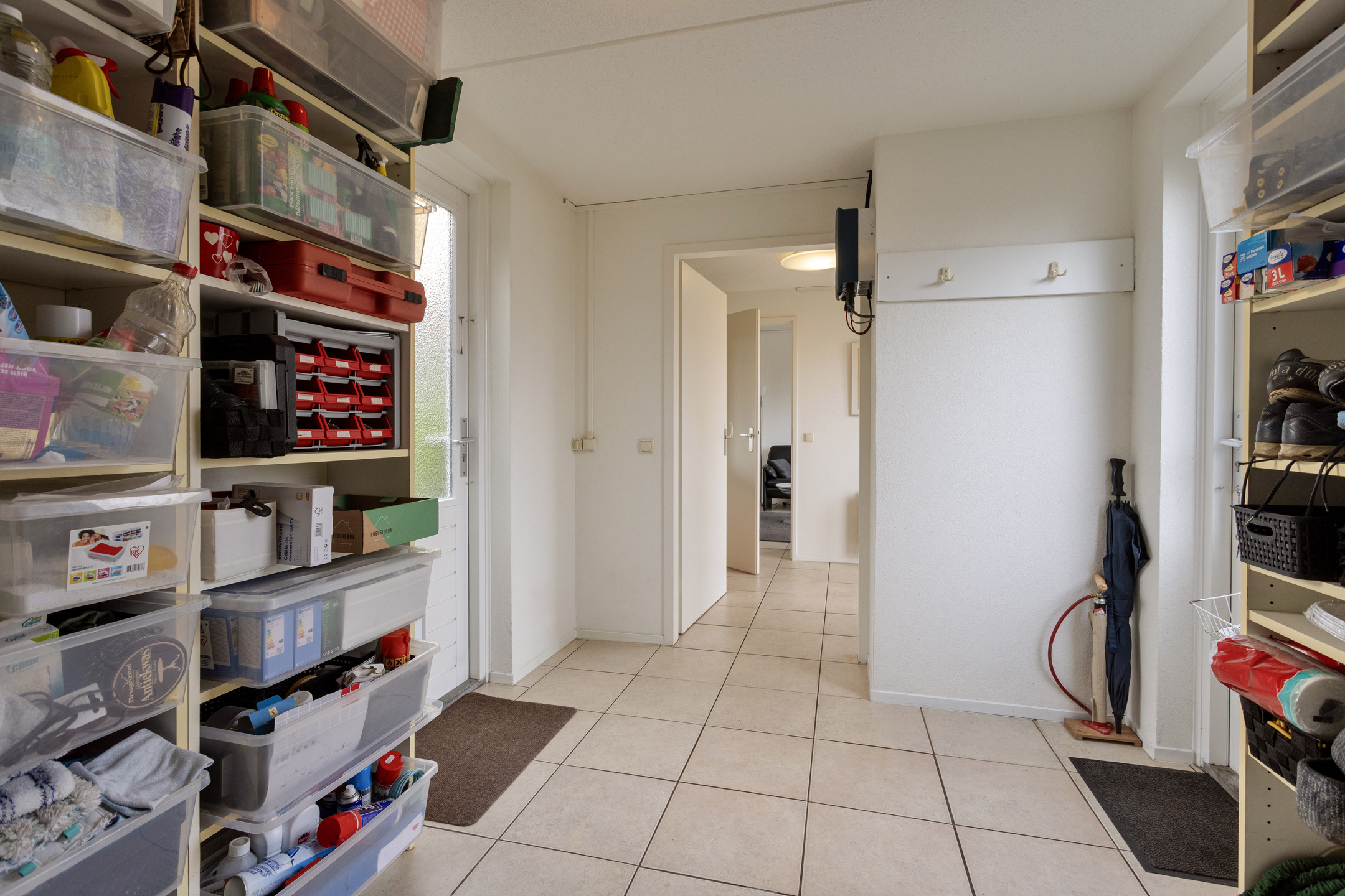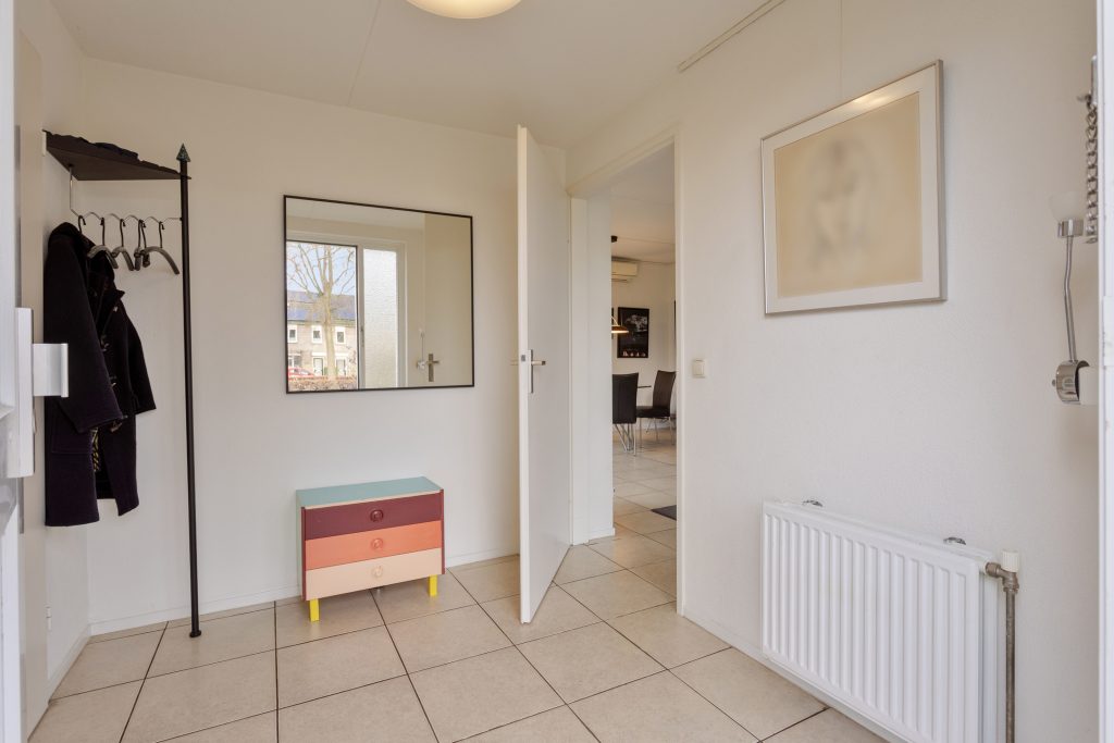 Via de entree komt u binnen in de ruime hal, links daarvan een praktische bergruimte en rechts van de hal bevindt zich de ruime woonkamer. De bergruimte is voorzien van een tegelvloer, aansluitingen voor was- en droogapparatuur, de opstelling van de cv-combiketel en vloerverwarmingsunit, de omvormer van de zonnepanelen en een deur naar de patio. Tevens is hier voldoende ruimte voor het stallen van bijvoorbeeld fietsen.