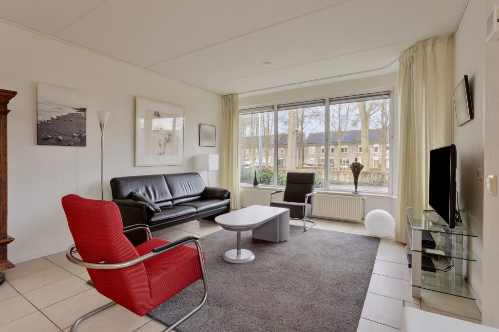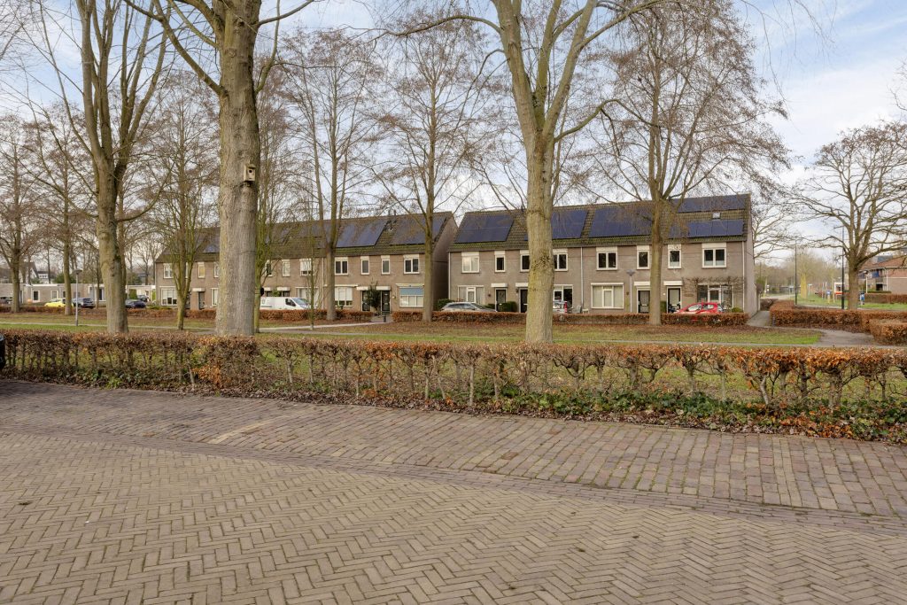 Ample parking is available in front of the house. It is located in a dead-end street, ensuring a quiet residential area with no traffic. At the front, you can enjoy a beautiful view of the extensive green space, while the woods are literally just around the corner.