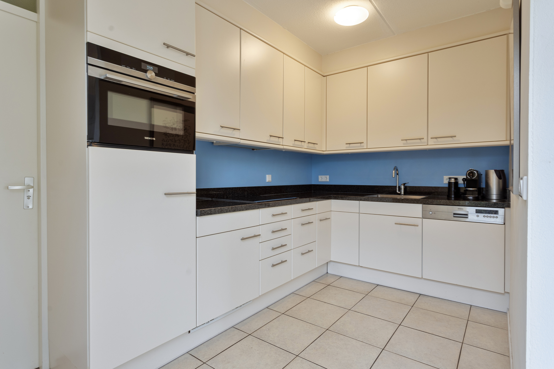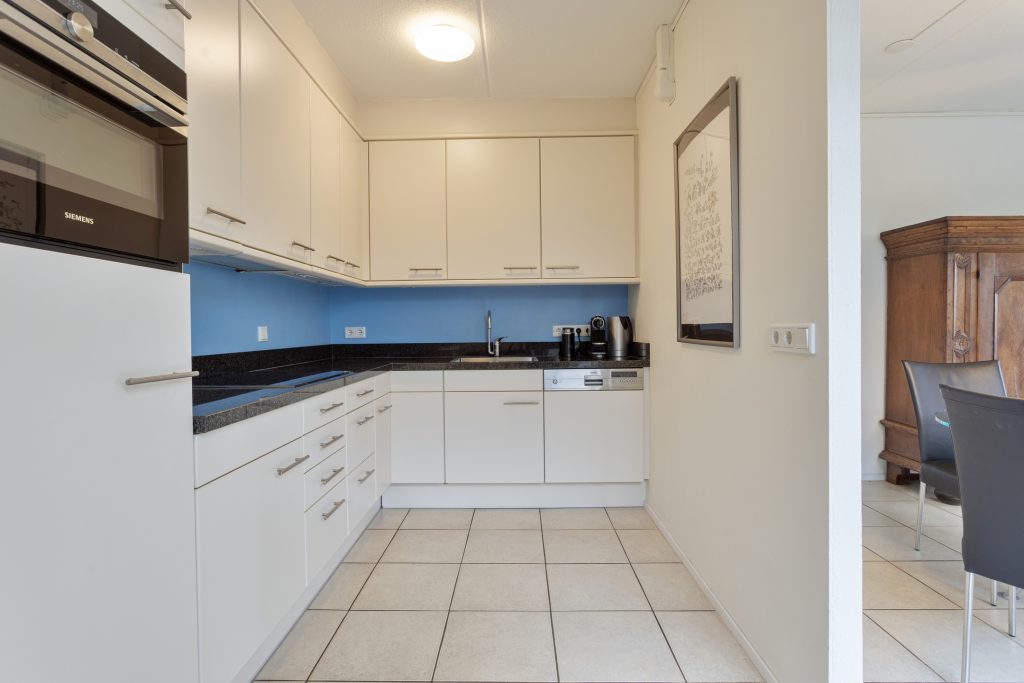 De moderne, halfopen keuken is uitgerust met een aanrechtblad met spoelbak, inductiekookplaat, afzuigschouw, koelkast, diepvries, vaatwasser, combimagnetronoven en voldoende kastruimte. Ook hier zorgt de lichtinval vanuit de patio voor een prettige en open sfeer.