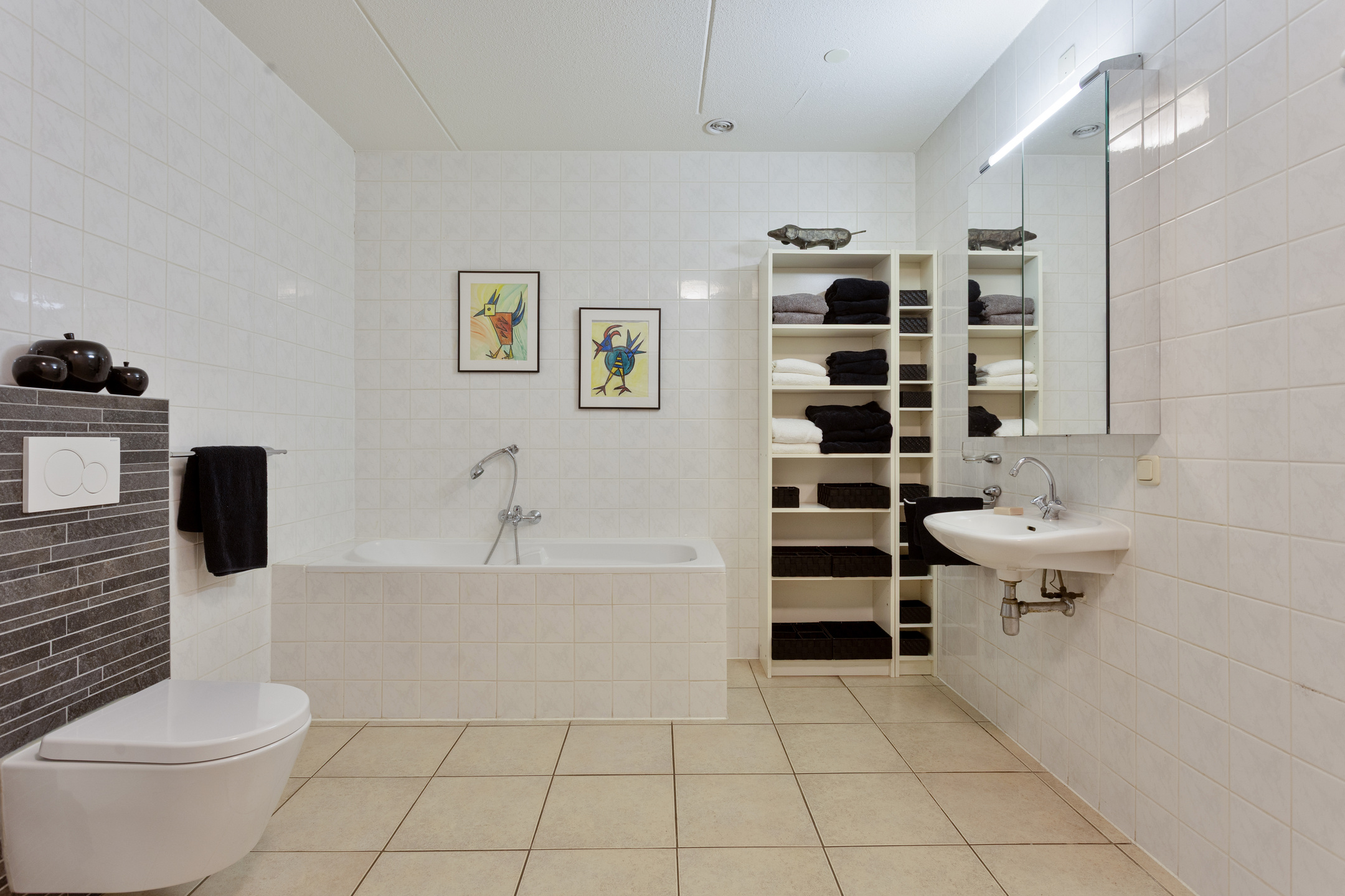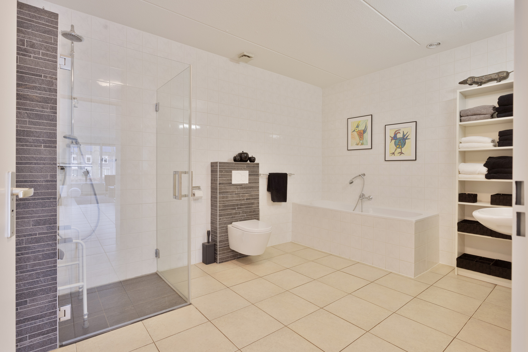 De volledig betegelde, zeer royale badkamer beschikt over een ruime inloopdouche, een wastafel, een ligbad en een zwevend toilet.
